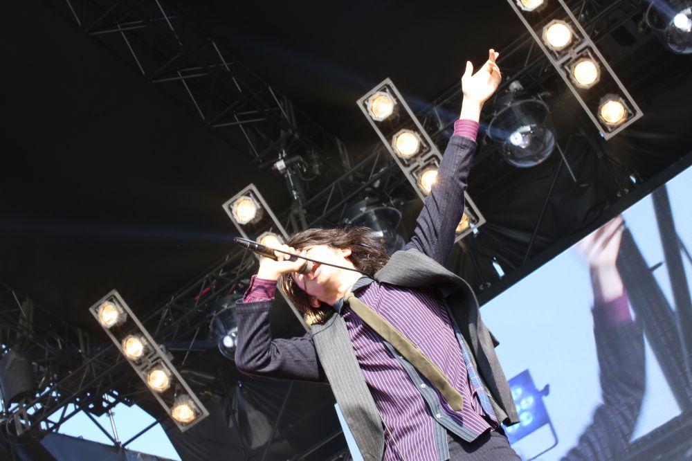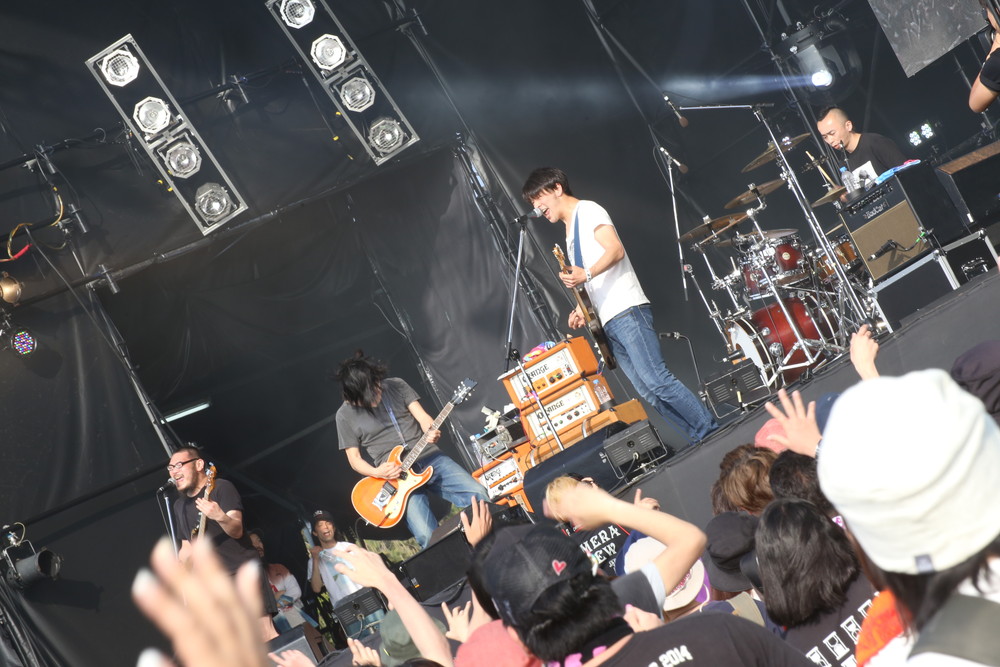 続いて、ようやく昼という時間帯にSEASIDE STAGEに登場したのがTHE BACK HORN。一曲目の「ブラックホールバースデイ」から、そのロック・ダーク・ヒーローぶりをいかんなく発揮。カントリー/ウェスタンに連なる2ビートに、舞踏のごとく動きまわる山田将司の歌とパフォーマンスが、ただならぬムードを醸す。例えば、ジョニー・キャッシュの血が、大衆演劇の血が、エレファントカシマシの血が、それぞれに希釈しあって音楽を奏でたら、こんなロック音楽が生まれるのではないか? と思わせる想像力が働く音だ。最後は「コバルトブルー」「刃」というヒット曲の連続でステージを締めた。
