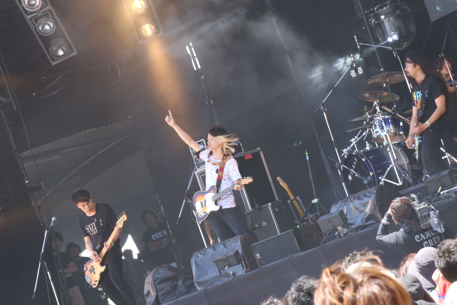 2日目SKY STAGEのトップバッターをつとめたのはアルカラ。この2日目は初日以上に強い風に各出演者が苦戦した一日だったのだが、アルカラの場合、ポスト・ハードコア譲りのメタリックで変化に富んだ演奏と、エモーショナルな歌に、吹き荒れる風がよく似合っていた。金爆に対抗すべく…というわけではないだろうが、こちらもバンドのマスコットである“くだけねこ”の着ぐるみ、さらにcinema staffの辻 友貴をステージに招いて、グリーン・デイの引用も登場する驚きのロック・オペラ曲「くだけねこのうた」を披露、高いエンターテイメントを発揮した。
