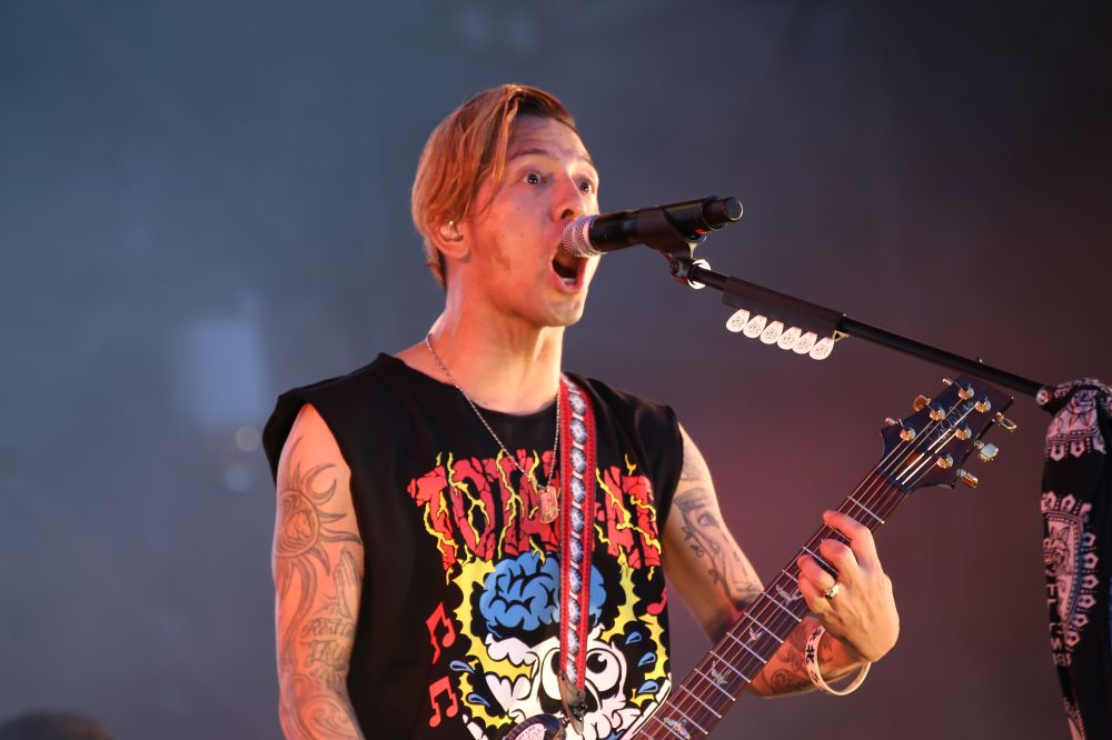 SKY STAGEに登場したROTTENGRAFFTYは、フロントマンの一人、NOBUYAが骨折という看板を掲げて車いすに乗って登場。冒頭から松葉杖をついたまま立ち、マイク片手に絶唱する根性を見せる。そのパフォーマンスは痛々しくもあったが、ROTTENGRAFFTYのラウド・ロックを基本に幅広く様々な音楽性を取り入れた演奏を聴いているうちにさほど気にならなくなった。ダブステップや4つ打ちなども取り入れ、オーディエンスも歌えるパートも設けられているというスタイルは英バンド、カサビアンあたりとの共通点も感じた。さらに後半には、10-FEETのメンバーも登場。“ロッテングラフィート”として京都バンド同士による夢のコラボで「金色グラフティー」を演奏する大団円を迎えた。