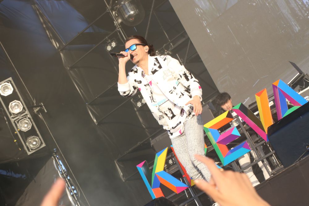 この日のKREVAは生ドラム、そして、DJとともにステージに登場。太陽の傾くなか、前半はあえてラップにこだわるストロング・スタイルで押しまくる。基本的に、三日間ほぼ全てのアクトがロック的な8ビートと、そこに乗っかるストレートな歌で聴かせるステージだっただけに、16ビートないしそれ以上に細かく、ラップで小節を刻み、緩急自在に展開する様子はそれだけで際立っていた。中盤では、体調が優れず、思うように声が出ないことを本人が明かし、<ここからはみんなの力を貸してくれ>と呼びかけて、身振りや合唱を促すステージにシフト。それでも最後まで毅然としたステージングを保った。さらに、終盤にはスペシャルゲストとして三浦大知を呼び込み。これには流石に大きな歓声が上がり、そのまま2人で「全速力 feat.三浦大知」を披露。“セッション”をテーマにしたフェスらしい盛り上がりを作った。