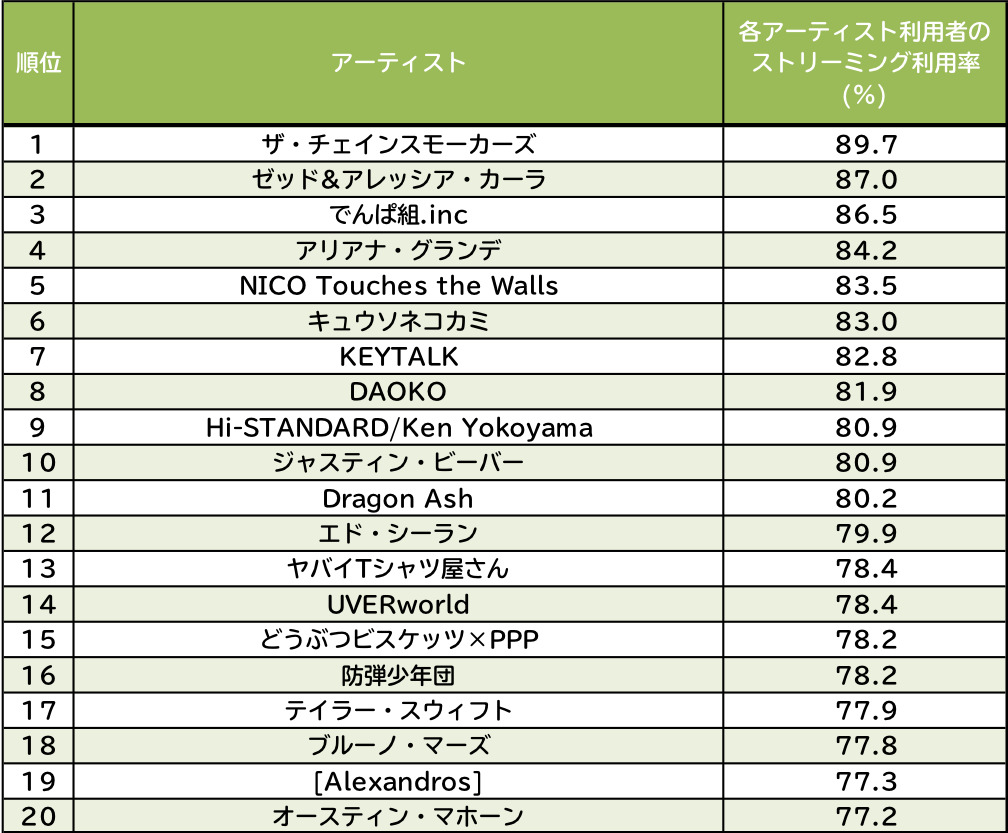 一方でCD利用者の場合、新しい地図や小沢健二、ジャニーズ系、ドラマ内のユニット、アイドルなど、J-POP寄りになっており、それぞれ大きく違いが出た。今後ストリーミングで上位に入るためにはストリーミングサービス利用者の嗜好性を考慮したマーケティングを考慮していく必要がありそうだ。つまり、CD利用率が高いアーティストと、ストリーミング利用率が高いアーティストではマーケティングアプローチ自体を変えていく必要がある、ということになる。