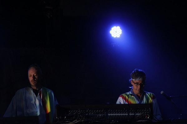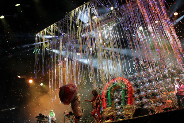 パンパンに膨れ上がったホワイト・ステージ。エキセントリックな虹色装束に身を包んだ2人組がステージに姿を現すと、彼らに“踊らされたい”オーディエンスからは、早くも奇声にも近い大歓声があがった。「コン・ニ・チ・ワ…」というロボット音声による“ご挨拶”をきっかけに、派手なダンス・ビートが夜の森を包む。女性ヴォーカルがステージに登場すると、大ヒット・チューン「グッド・ラック」を皮切りに、「レッド・アラート」「ロメオ」などの定番曲から、8月20日リリース予定の最新作『Junto』収録ナンバーまで、息つく間もなく立て続けに披露。シンガー、ダンサーがクルクルと目まぐるしく入れ替わる、とにかくカラフルで豪華絢爛なステージングに、思わずこの空間ごとどこか別世界に飛んで行ってしまったのではないか、というような錯覚に陥ってしまう。そんな現実離れしたステージのフィナーレには、シンガー、ダンサーのみならずゴリラや子供まで入り乱れる、まさに“おもちゃ箱をひっくり返したような”という言葉がぴったりの状態に。それらをも全て包括する摩訶不思議なムードは、彼らがステージを降りた後も、しばらくの間フワフワとオーディエンスの隙間を漂っていた。