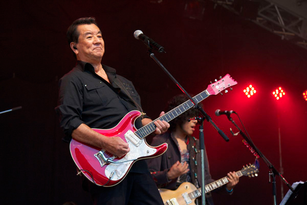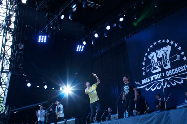 文句なしの快晴。3日にわたる夢の扉をこじ開けるのは、毎年恒例ROUTE 17 Rock’n’Roll ORCHESTRAだ。強力なバンド陣と日本のロック・シーンを代表するフロントマンによる、とびきり豪華なロックンロール・ショー・タイム。今年はなんとTOSHI-LOWがスライ&ザ・ファミリー・ストーン「アイ・ウォント・トゥ・テイク・ユー・ハイヤー」で口火を切るという、なんとも意表を突いた幕開けとなった。非常に彼らしい、気合の入ったMCでオーディエンスを煽ると、自身の思い入れの深い一曲だという、THE ROOSTERSの「レザー・ブーツ」で畳み掛ける。いきなりエモーション全開、灼熱の太陽に負けないホットないステージを引き継いだ2番手は、ド派手なスーツをバシッと決めたトータス松本。「オー・プリティ・ウーマン」「シェイク・ユア・マネーメイカー」とスタンダード2曲をしっかりと聴かせ、最高のエンターテイナーぶりを発揮、観客をおおいに沸かせる。そして、こちらも恒例のMIKUNI?DOLLSによるキュートな「VACATION」のパフォーマンスから一転、甲本ヒロトがステージへと飛び出て来る。「アナーキー・イン・ザ・UK」の日本語バージョンに続いて、「みんなの大好きな忌野清志郎が歌った曲。」「もしここに、CHABOみたいにギターのうまいやつがいてくれたらなぁ!」という、若干白々しい(笑)煽りとともに仲井戸“CHABO”麗市を呼び込むと、RCバージョンの「上を向いて歩こう」に突入!もちろんステージとオーディエンス全員が一体となり、最高の盛り上がりを見せる。その後、バトンを渡されたCHABOがブルース・スプリングスティーンの「ハングリー・バード」をしっとりと日本語で聴かせた後に弾き出したイントロは、「雨上がりの夜空に」。もちろんオーディエンスは大合唱で答え、ショーはクライマックスへと。全出演者が再びステージに戻り、ザ・ポーグスの「フィエスタ」をひたすら“アイルランド”という言葉のみで歌いまくる、最高に陽気なお祭り騒ぎで夢のようなロックン・ロール・ショーは締めくくられた。