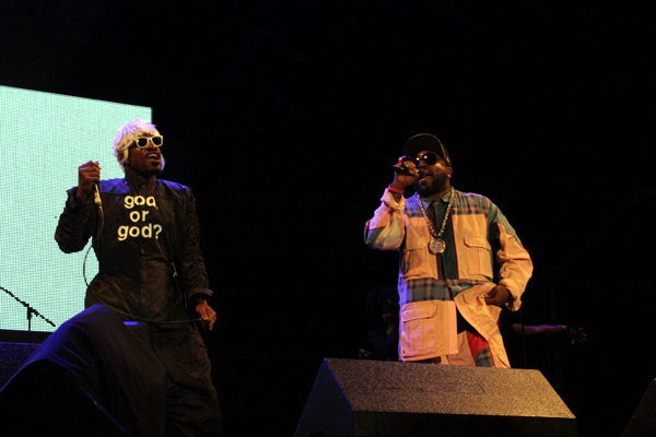 ヒップホップ界屈指のエンターテイメント性とド派手なパフォーマンスでおなじみのアウトキャスト。約7年ぶりの活動再開を受けての来日とあって、最終日の22時~という時間帯にも関わらず、期待に胸を膨らませたオーディエンスたちが小雨舞うホワイト・ステージに集結した。スクリーンにアルバム『スタンコニーヤ』のジャケにも描かれているモノトーンの星条旗がドーンと映し出され、ショーがスタート。DJ、コーラスの女性2名、ベーシスト(こちらも女性)とともに同アルバム収録の名チューン「B.O.B.」「ガソリン・ドリームス」で一気にオーディエンスを煽るアンドレ3000とビッグ・ボーイの2人。いきなり初期のヒットチューンを披露するニクイ選曲にファンも冒頭から狂喜乱舞。ルックスはチグハグ(?)ながら、圧倒的な個性が絡み合う2人の絶妙な掛け合いは休止期間を経ても一切衰え知らず。「Ms.Jackson」「Hey Ya!」などのキラーチューンを中盤に挟みながら、スリーピー・ブラウンの登場やそれぞれのソロ・コーナーなど、一瞬たりとも気の抜けないスリリングなショーを展開していく。曲ごとに用意された映像で視覚的にもまったく飽きさせない、ラストの「ザ・ホール・ワールド」まで一瞬たりとも目が離せない怒涛の2時間弱。新旧ヒットナンバーが入り乱れる、デビュー20周年を祝うにふさわしいステージとなった。