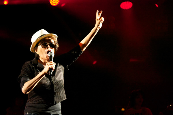 出演決定時から“ざわざわ”させていたが、もちろん当日も“ざわざわ”させてくれた。開演前のフロアから外国人男性による発音の良い「YOKO!!!!」声援が飛び交い、思わず「ジョォーン!」と返したくなる。あの奇天烈な叫びによる彼女のパフォーマンスは敬遠されがちだが、やっぱり注目度は高いのだ。荒々しい怒号のような声援が続き、Nels Cline、小山田圭吾、あらきゆうこ、大野由美子、PIKA☆、本田ゆかと豪華なバックメンバーと共におなじみのピースサインで登場。大歓迎で迎えられ、へヴィーなバンドサウンドで幕開け。オノ・ヨーコの全力のシャウトがRED MARQUEEに解き放たれる。御年81歳にして彼女は命を振り絞るように叫ぶ。詩の朗読やメンバー全員でのドラムパフォーマンスなど様々な展開が用意され、アヴァンギャルドなステージに聴衆は圧倒され、呆然と立ち尽くし、気づけば熱狂していた。今年のグラストンベリーでのヨ・ラ・テンゴとのパフォーマンスがいろんな意味で話題となったが、生で体感していないから「なんじゃこら?」なる。きっとグラストンベリーで体感した人たちはその熱量の高さと生命力に驚いただろう。そして、バックバンドは違えど今回このフジで体感した人たちも同じだ。彼女は「なんじゃこら?」などそんな次元にはいないのだ。