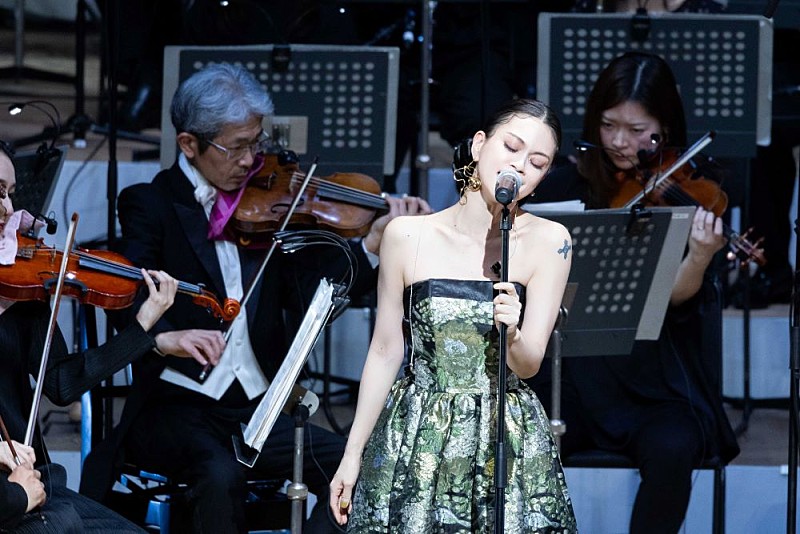 兵庫公演で三番手をつとめたのは一青窈。登場するやいなやステージに座り込み、2002年のデビュー・ヒット曲「もらい泣き」を歌いながら、立ち上がって右へ左へ。客席に手拍子を求めたり、オーケストラの真ん中に飛び込んで歌ったり。天真爛漫なパフォーマンスで、満員の観客を魅了する。