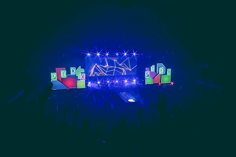 ここからは一転、クラブライクに踊らせる「FRDC Remix」コーナーに突入。今回のアリーナ公演で初披露となる「ひとときのラズベリー」は、ピンク色の照明が甘酸っぱい雰囲気を醸し出す。「ナイトステップ」からは、ステージ中央から伸びる昇降式の花道にメンバーが移動。三原康司(Ba.)はシンセベース、高橋武(Dr.)はサンプリングパッドを用いたミニマルなセットに切り替え、原曲とは異なるエレクトロなアレンジで会場に程よい緊張感をもたらした。