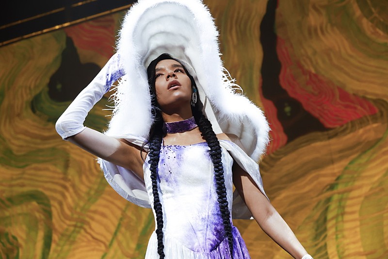 〈灯油でぐるっと輪を描いて マッチを〉 歌詞カードには記されていない「先生」のラストヴァースを歌いながら、ステージ中央に立つアヴちゃんはマッチを擦る仕草を見せる。直後、スモークが焚かれると同時に、ステージ後方の映像やライティングで燃え盛る炎が表現…