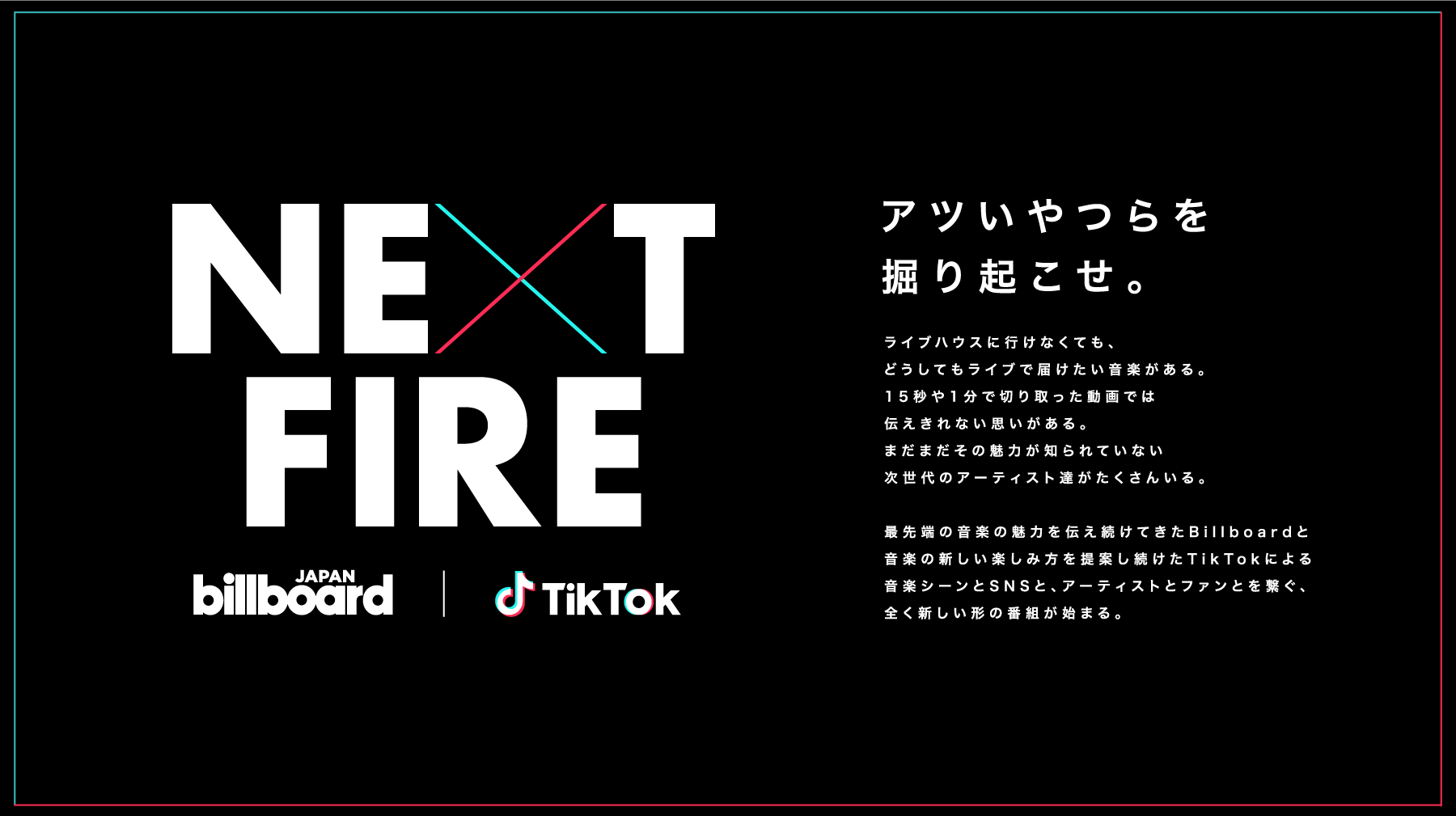 なお『NEXT FIRE』は、今回を持ちましてレギュラー放送を終了いたします。今後もBillboard JAPANとTikTokは、次世代アーティストの発掘やライブの新体験を創出し、機能やコーナーの拡充に合わせアーティスト支援に繋がる様々な方法を模索してまいります。