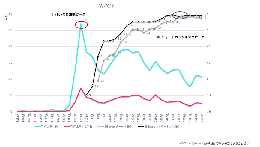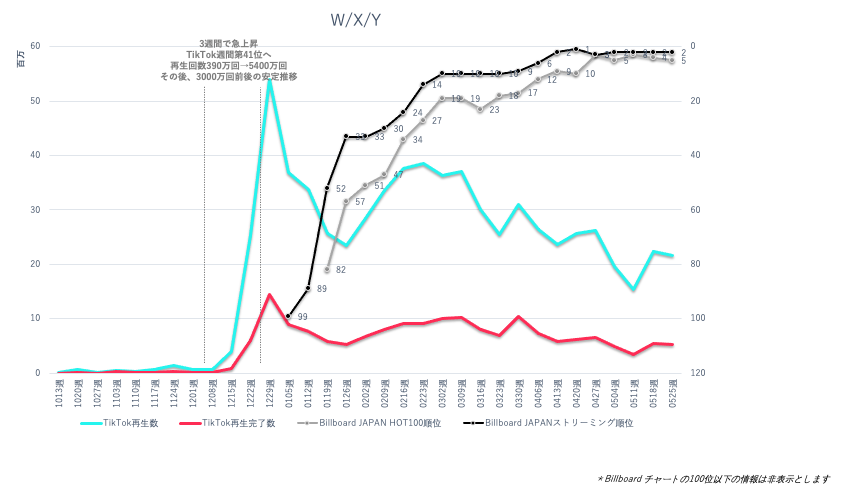 「W/X/Y」は2021年5月26日に配信リリース。TikTokでは、2021年12月15日の週から投稿が増え、12月29日の週にTikTokの週間ランキング第41位を獲得、週間再生回数も5,000万回に上った。その後も3月末まで週間3,000万回前後という高い水準で再生回数が安定的に推移した。