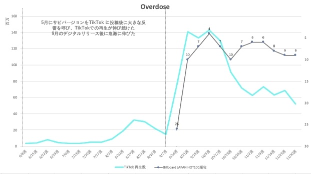 2021年5月からTikTokでの投稿をスタート。2022年5月に「Overdose」をTikTokに公開すると大きな反響を呼び、9月のデジタルリリースまで徐々に再生数が増加していった。そして9月7日に自身初の配信楽曲として「Overdose」をリリースすると、一週間でTikTokでの再生ピークに到達した。ビルボードジャパンでは、9月21日にストリーミング17位、HOT100で26位に初登場。ストリーミングチャートでは、翌週に6位を獲得し、トップ10内を維持(12月21日発表チャート時点)、集計期間わずか3か月にも関わらず、ストリーミングチャートで年間64位、総合75位に食い込んだ。