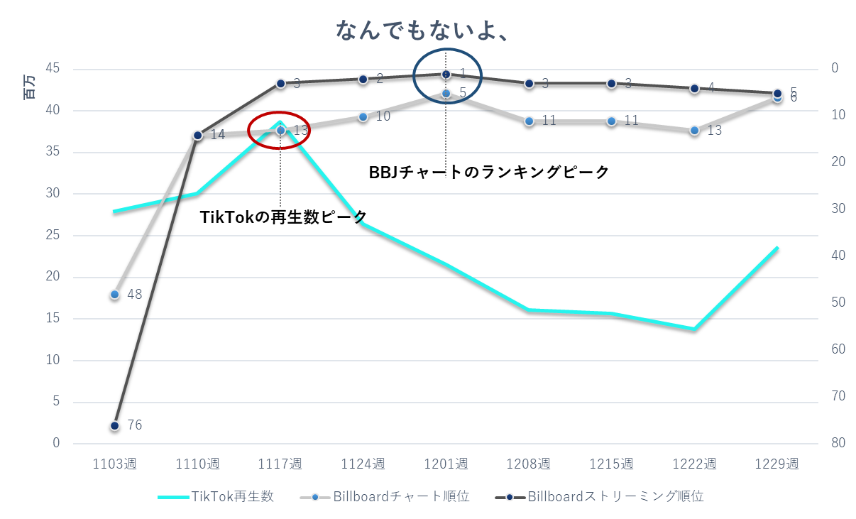 そのためTikTokが先行してピークに達し、その後ビルボードジャパン・チャートのピークを迎えるパターンが観測された。TikTokでの高い露出によって注目を集め、外部でのパフォーマンス上昇に繋がったのではないかと推測できる。