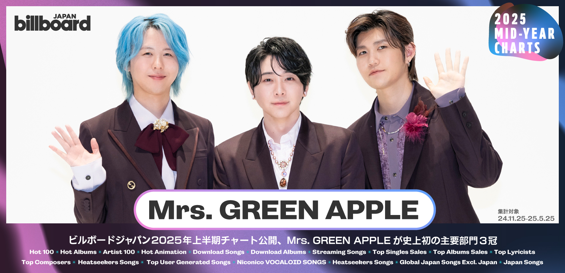 Billboard JAPAN 2025年上半期チャート発表、Mrs. GREEN APPLEが“JAPAN Hot 100” “Hot Albums” “Artist 100”首位