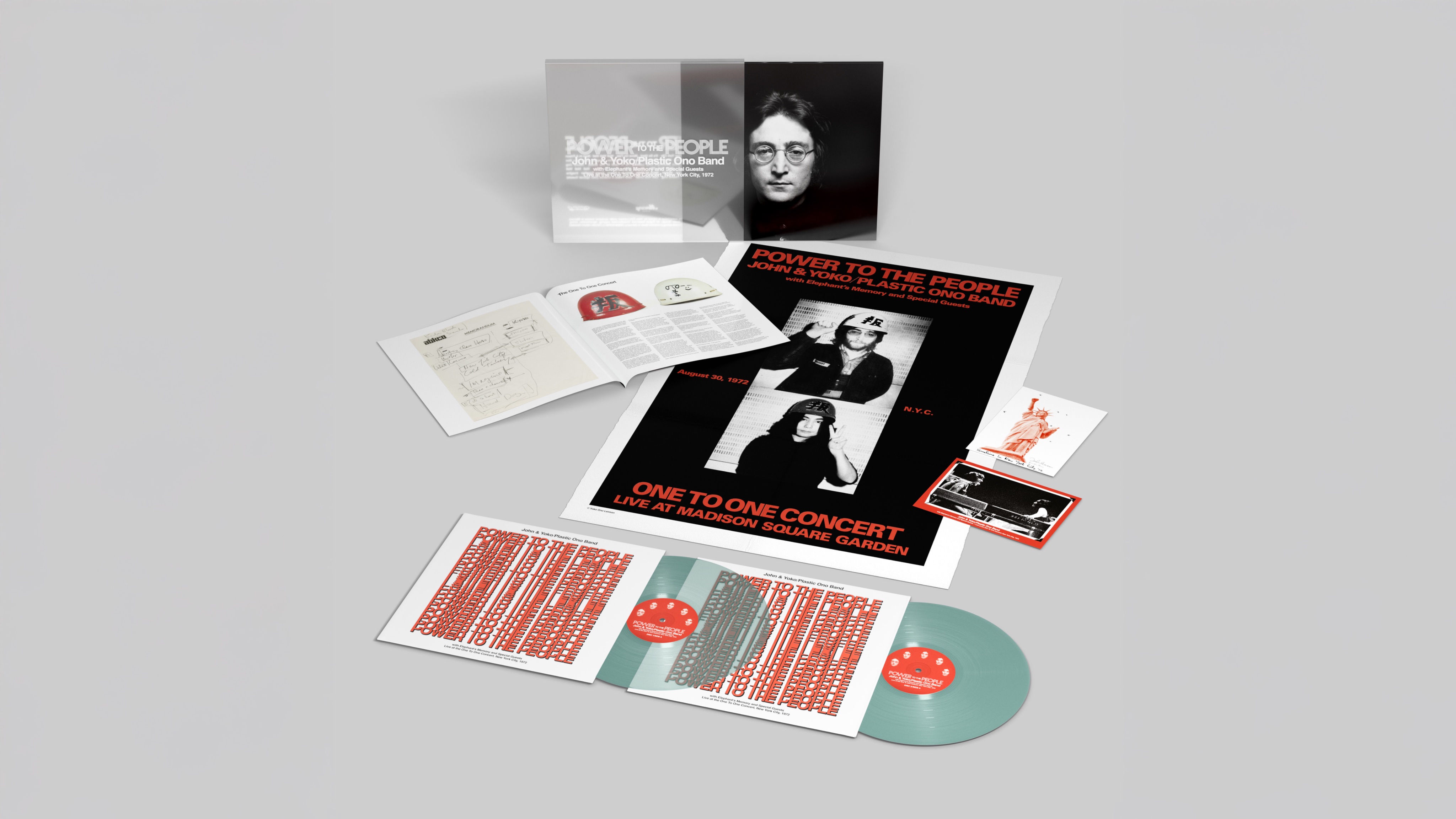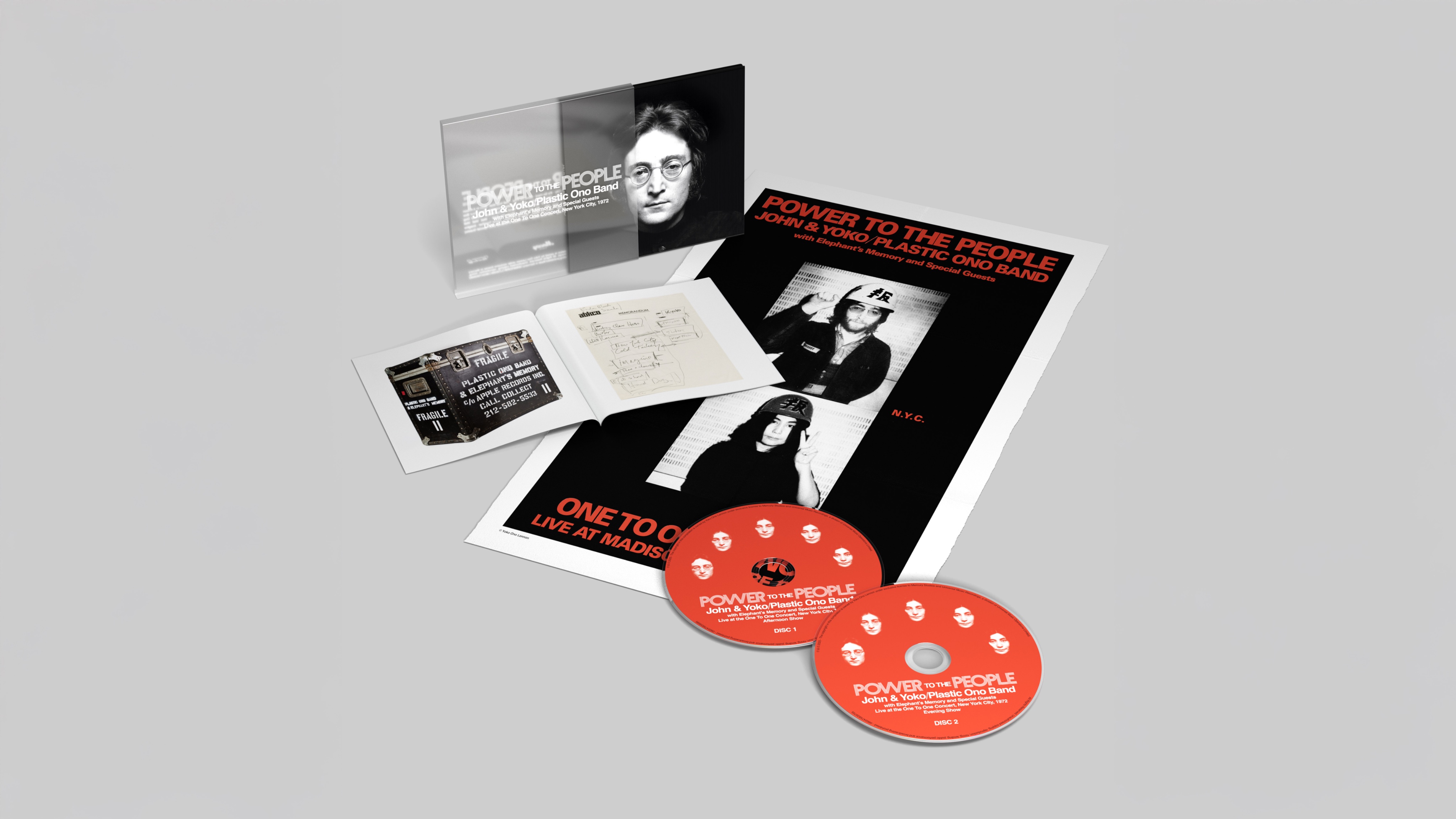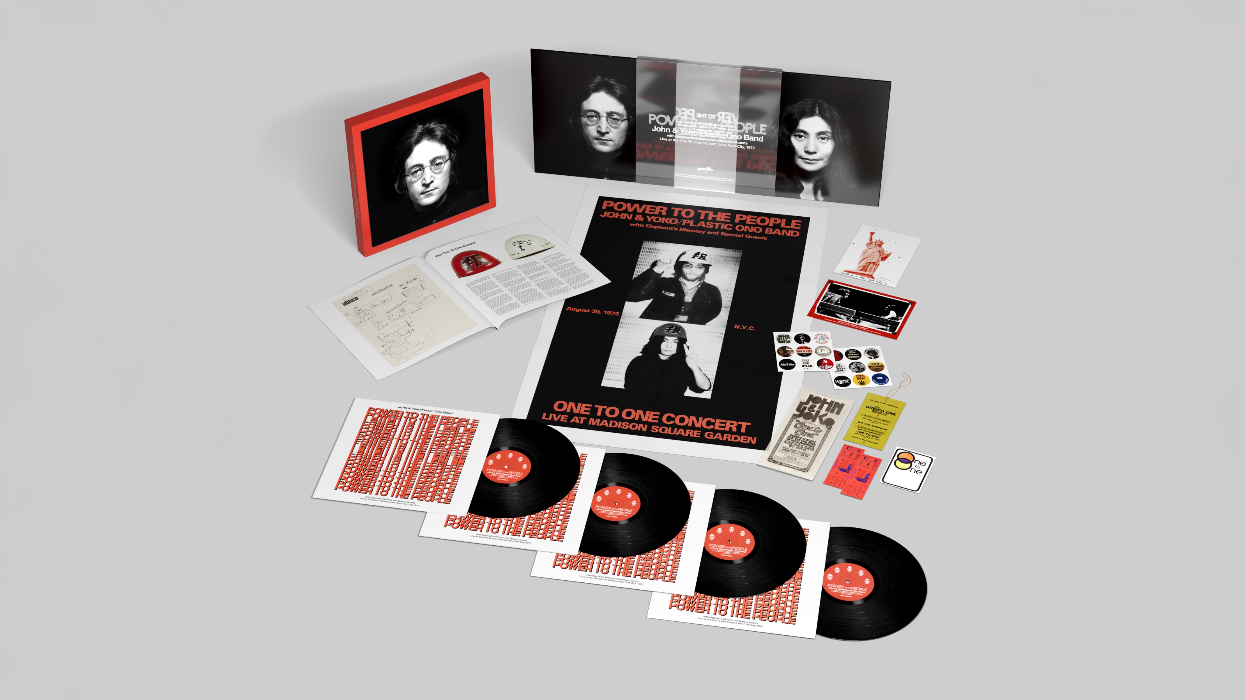 本作のボックスセットには、サイモン・ヒルトンがデザインと編集を担当し、新旧のインタビューから集められたジョンとヨーコら関係者の証言を通じて、収録楽曲に纏わる歴史をくまなく紐解く204ページに及ぶハードカバーブック(未公開の写真や歌詞、イラスト、テープの箱や関連の品なども掲載)に加え、ヴィジュアルと文字で当時の背景を伝える6面折りの新聞風ポスター、ステッカーシート、特別に再現したコンサートチケットとバックステージ・パス、アフターショー・パスのレプリカを封入したVIP用封筒が付属。