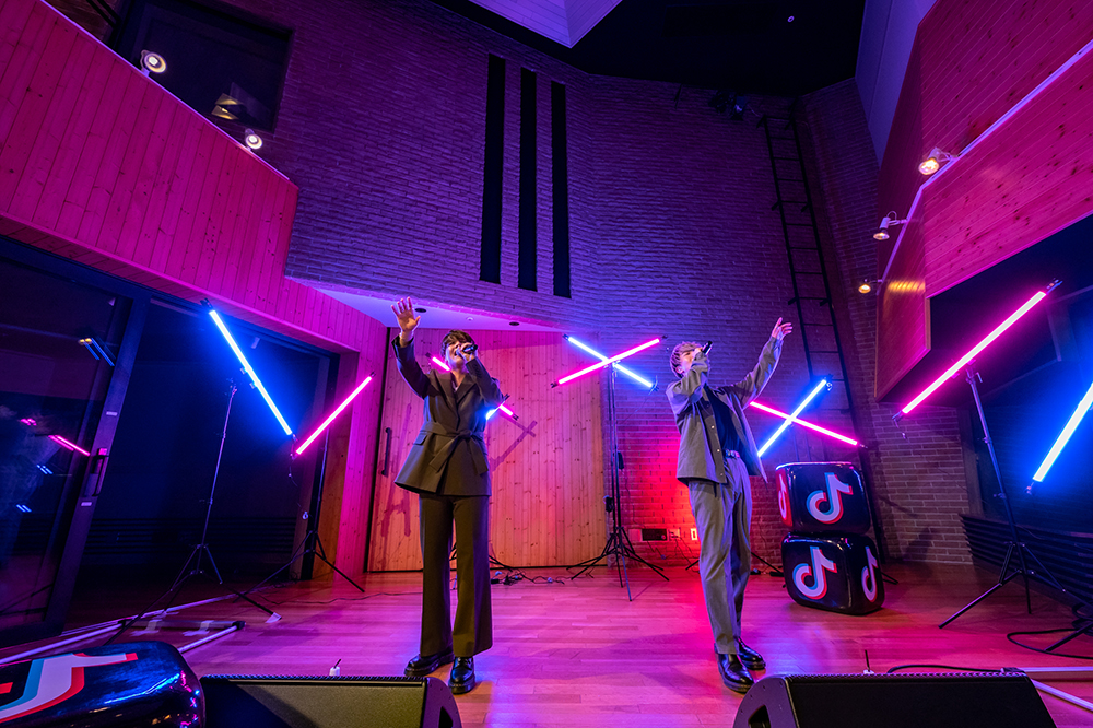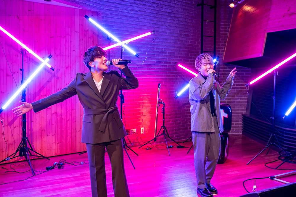 フォーマルな格好でステージに現れた鈴木鈴木。ライブのスタートを飾った楽曲は「君と僕はさ」だ。時折、目線を合わせながら息の合ったコンビネーションで美しいハーモニーを響かせる。今回の配信は、2人とも楽器を持たずにスタンディングでパフォーマンスするスタイルだ。