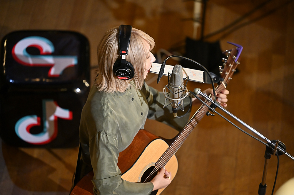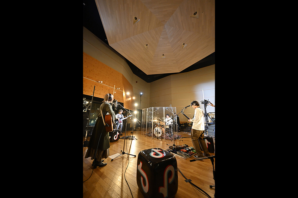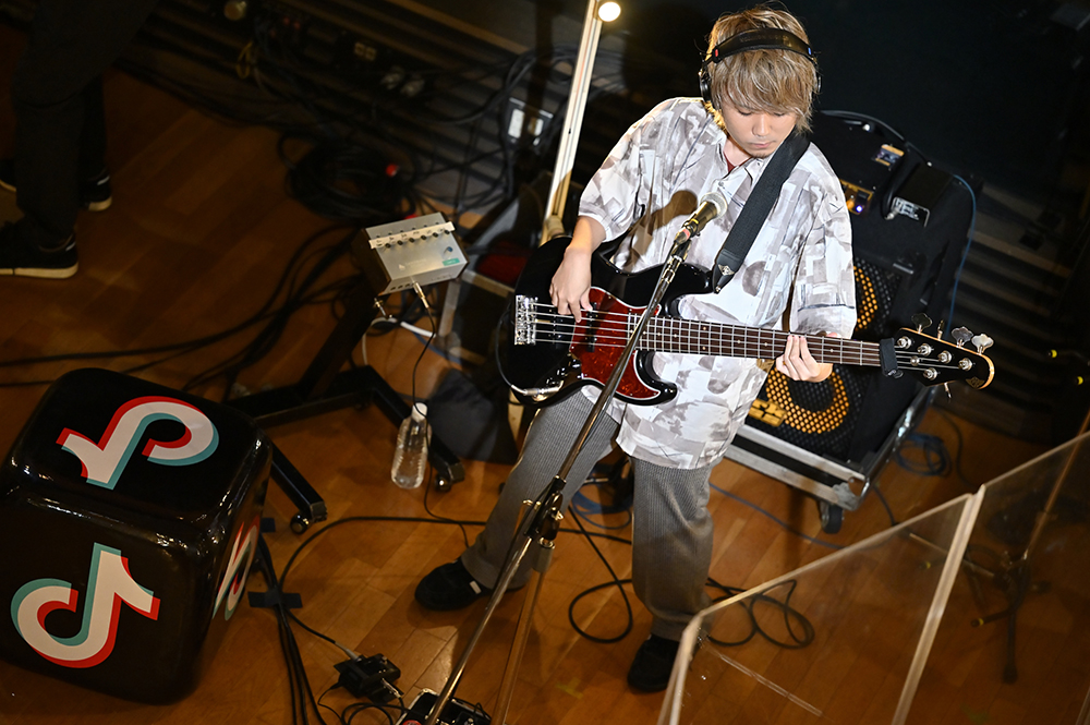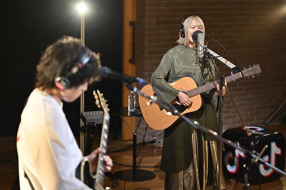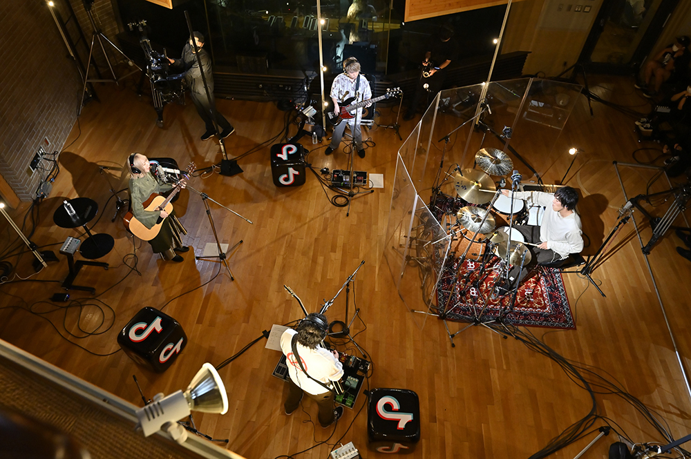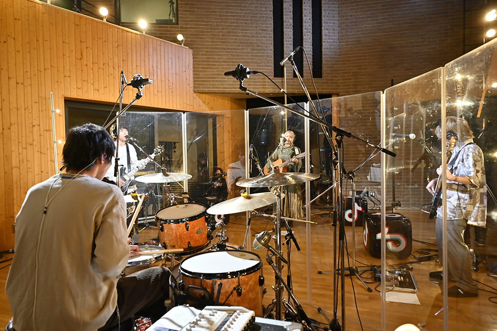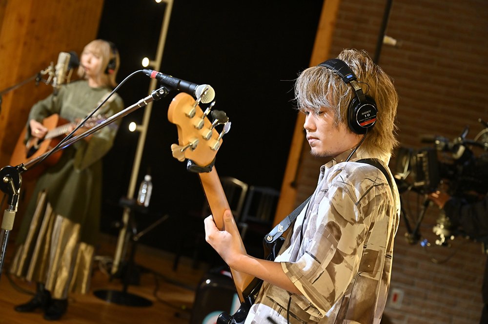 画面が切り替わると、温かみのあるライトに照らされたあたらよが映し出される。すると、まーしー(Gt.)の軽快なギターリフから「晴るる」がスタートした。今回のステージは4人が円を描くように向かい合うスタイル。また、至近距離を捉える見事なカメラワークによって、臨場感をたっぷりと堪能することができた。最初のMCでは、ひとみ(Vo./Gt.)が挨拶すると「緊張しております」と笑顔を見せる。2曲目は「最後くらいこっち見てよ」という呟きから始まった、あたらよの代表曲とも言える「10月無口な君を忘れる」。たけお(Ba.)とたなぱい(Dr.)が生み出す安定感のあるリズムに、ひとみの歌声とまーしーのコーラスが美しく乗っていき、エモーショナルな空間が築き上がっていく。リアルタイムで視聴者からは「最高」「好き」「鳥肌立つ」といった歓喜と興奮に満ちた声が多く寄せられていた。また演奏後に「この楽曲を通して私たちを知ってくれて嬉しく思います」とひとみが胸中を語る場面も見せた。
