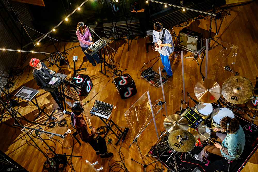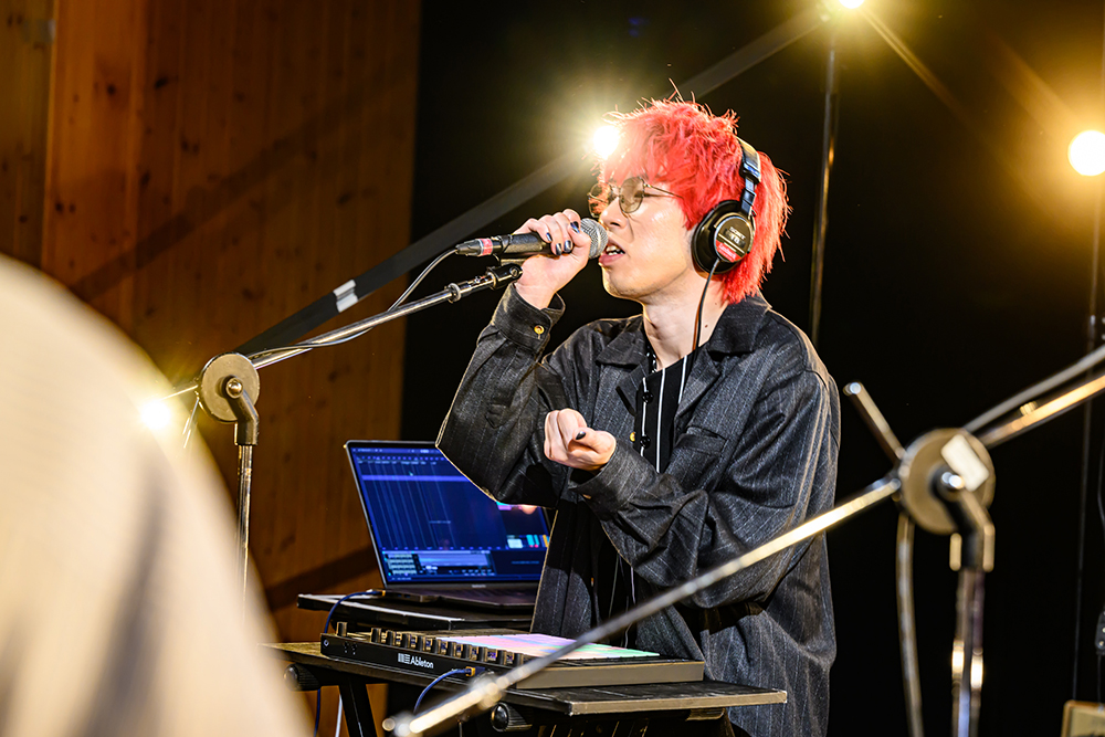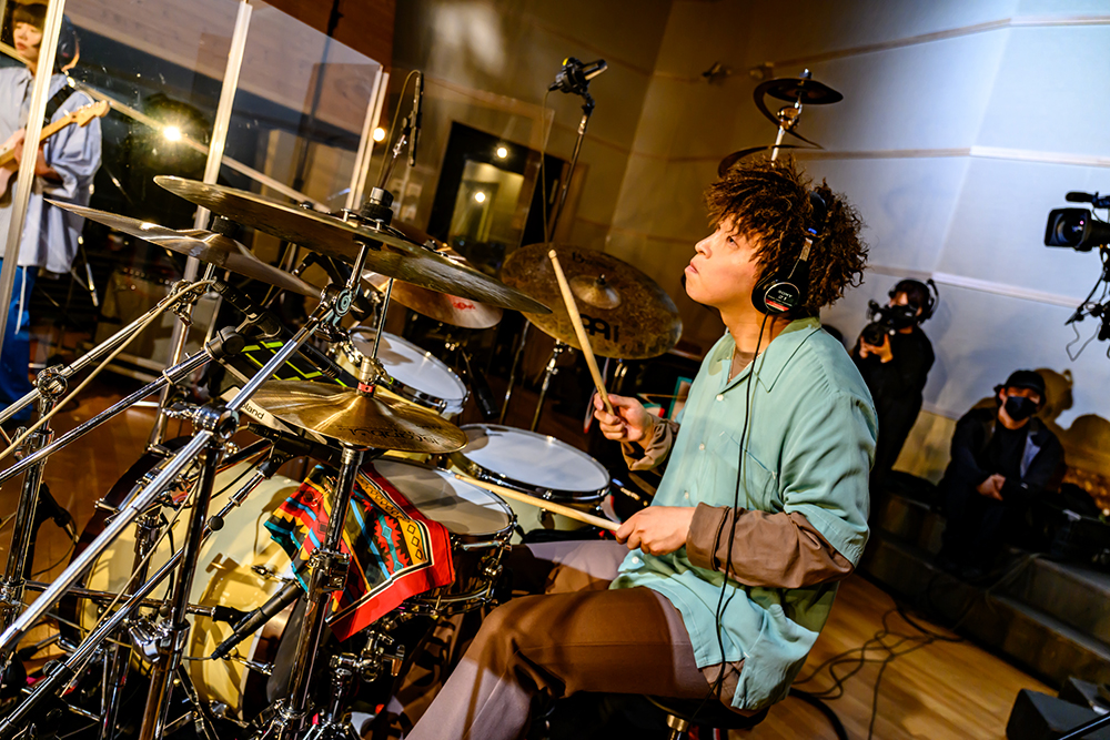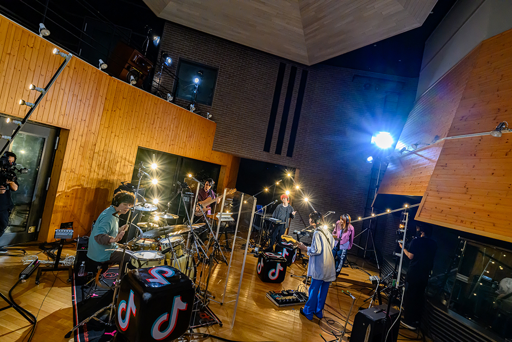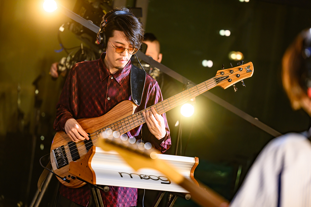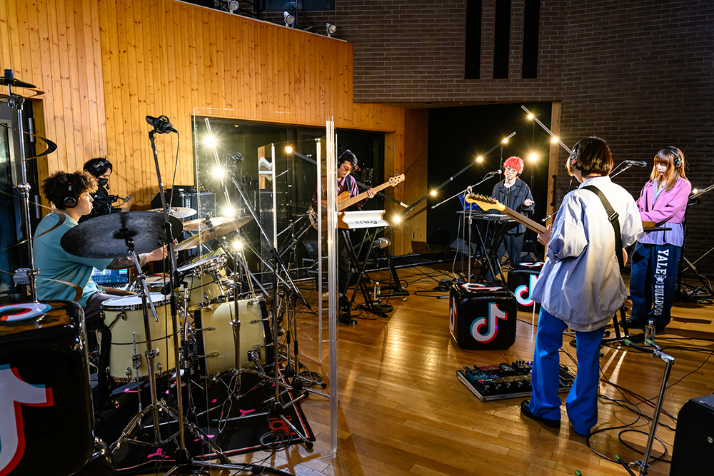 “決して叶うことのない儚い恋”が描かれた最新曲「ジェネリックラブ」では、ミドルテンポのビートに乗ってyonkeyとやすだちひろ(Vo.)の美しいハモリが会場に響き渡っていく。そのまま途切れることなく、yonkeyの“1,2,3,4”という聞き馴染みのあるカウントを主軸に、メンバーがゆっくりとリズムを刻み始める。ここで披露されたのは、TikTok内で、ダンスチャレンジをはじめ様々な動画に使用されてバズを起こしている「タイミング〜Timing〜」。名曲をカバーする動画シリーズ<MIDNIGHT SESSION>から生まれ、彼らを一躍有名にさせた楽曲だ。各々が奏でていた音がぎゅっと集約して重厚になったイントロがスタート。言うまでもなく纏まりのあるバンドサウンドを轟かせ、コメント欄でも“かっこいい”“一緒に踊った”というように盛り上がりを見せた。