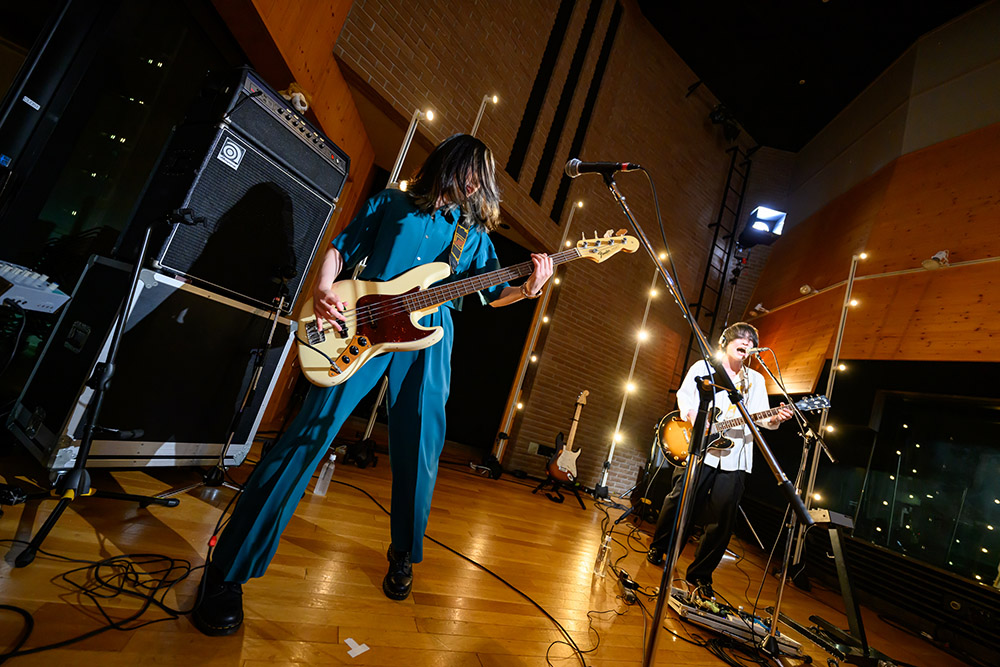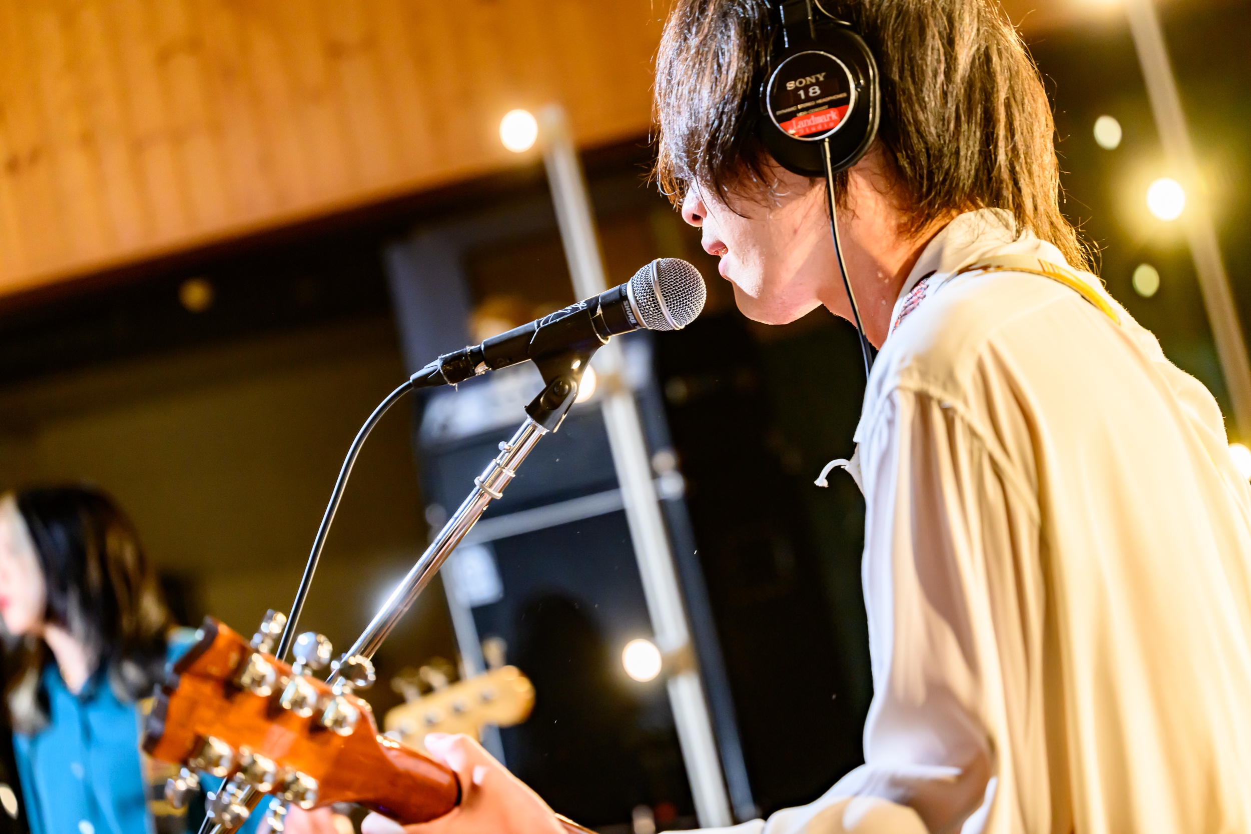 続いて、6月のマンスリーピックアップアーティストに選ばれたLaughing Hickがスタジオに登場。メンバーがそれぞれの持場につき、ほりうちこうた (Vo./Gt.)が 「山梨県Laughing Hick、あなたに歌を届けに来ました。最後まで楽しんで行きましょう!」という一言から「Local Hero」が始まる。アップテンポで軽快なロックが前向きな歌詞と絶妙にマッチしている。ほりうちとあかり(Ba.)のハモリも良いアクセントだ。そこから立て続けに「中指を立てて」に突入。どこか懐かしい哀愁や切なさと同時に反骨精神も感じられる歌詞が印象に残る。