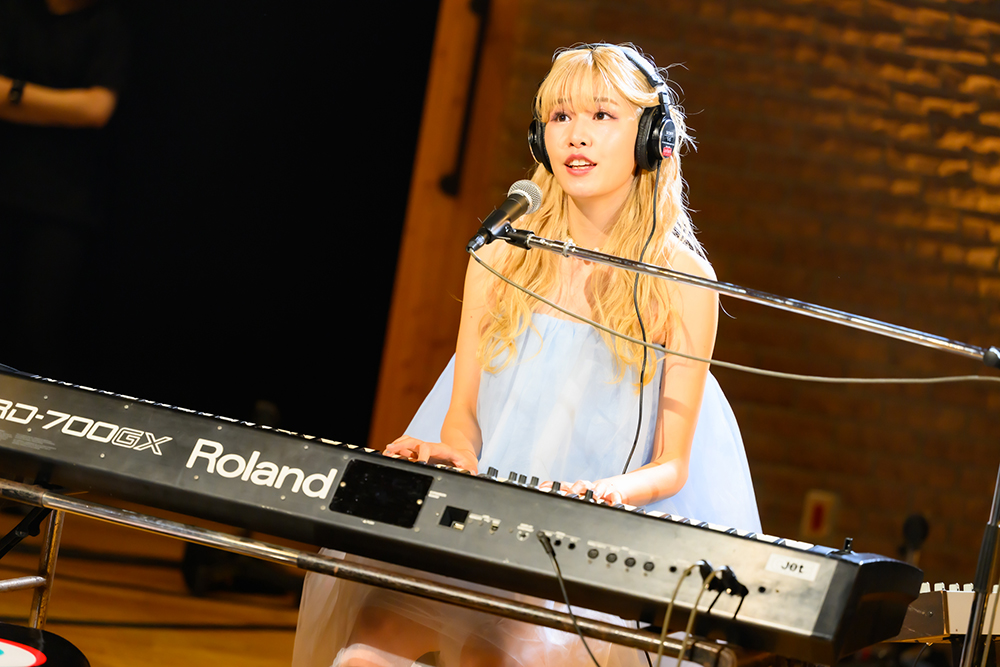 スタジオに笑顔で登場しピアノの前に座ると 「Fendi」でライブはスタート。透き通るような歌声とピアノで奏でられるバラードはダイレクトに心に刺さる。「初めての方もそうじゃない方も、こんばんは。浅場佳苗です」と挨拶し 「普段は1.5畳の自宅の防音室から歌をお届けしていることが多い私ですが、今夜は画面の向こうで観てくださっている皆さんだけでなく、たくさんのスタッフの皆さんが一緒にこのステージを作ってくださっていて。この場所に今夜こうして立てることを幸せに思っています」と感謝を伝えた。