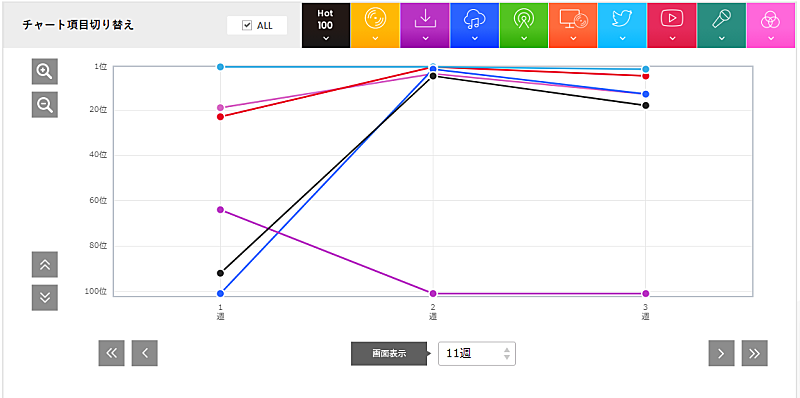 「Rocketeer」は先述の通り、先週から今週にかけて少しランクダウンしているが、まだまだ粘り強さを見せそうな予感がする。というのも、ストリーミング関しては2位から13位へと大きくダウンしたものの、動画再生数に関しては1位から5位、Twitterのつぶやき数では1位から2位と、配信後2週目も上位をキープしているからだ。しかも、フィジカルのCDリリースが11月3日に控えているというのも大きい。おそらくそのタイミングでも大きくチャートアップするはずだ。もちろん、目標は首位獲得だ。あとがどういったメディア露出をし、一般層に認知していくかがキーとなるだろう。