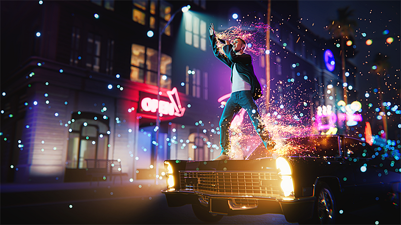 街が夕暮れに染まると車が走り出し、ボンネットに立ったまま歌い始めたのは前述のNo.1ヒット「ピーチズ」。反映はされないが、各々の部屋では大歓声が飛び交っていただろう。バーチャル・ライブも、ネオンライトに照らされた街をクルーズしながら軽くステップする、ミュージック・ビデオの世界観をそのまま再現したような作りで、2曲目にしてボルテージが急上する。画はバーチャルだが歌声と演奏はリアル。ライブの“生感”も十分堪能できる演出になっている。曲を終え、街を抜けて郊外へ……。