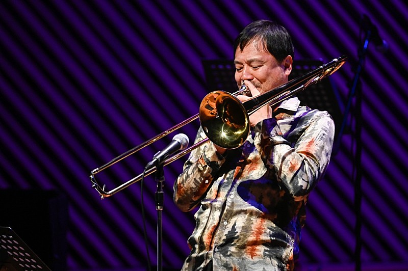 今回の【KYLYNが来る】のバンド・メンバーは、エレクトリック・ベースとダブル・ベースを弾く井上陽介、パーカッションのヤヒロトモヒロ、ギターの井上銘。さらに、アルト/ソプラノ・サックスの本多俊之とトロンボーンの村田陽一だ。村田とともに時に華のあるソロ・パートも担った本多は、唯一の1979年版KYLYN参加者となる。他は、現在近い付き合いのあるKYLYN感覚に長けた奏者たちに声がかけられた。