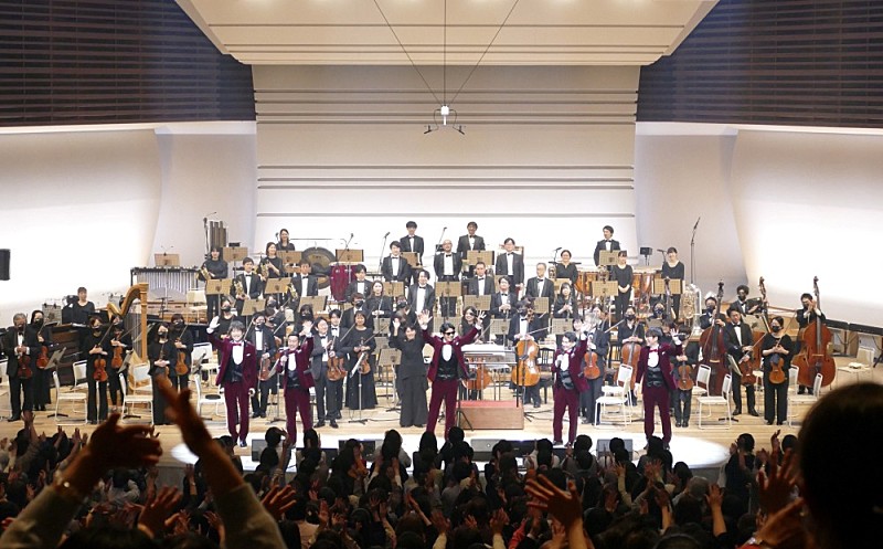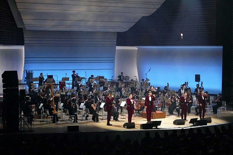 「Overture」の余韻が残る中、5人がステージ中央に立ち、間髪入れず村上が〈「愛してる」って最近言わなくなったのは本当にあなたを愛し始めたから〉と「ひとり」を歌い始め、コーラスとオーケストラの音が共に音を“紡いでいく”と、得も言われぬ感動が降ってくる。大サビでは弦がピチカートを刻み、優しく包み込んでくれるようで、いつもとは違うオーケストラアレンジで楽しませてくれ、村上のファルセットもより際立つ。続く、ホルストの「金星」をマッシュアップさせた「星屑の街」をはじめ、アカペラ曲をオーケストラが演奏することによって生まれる相乗効果を、最大限に感じることができる楽曲が並ぶ。ホルンとフルート、オーボエの美しい旋律の「金星」からの「星屑の街」は、5人それぞれの声が合わさるというよりも、交差することで光のようなものが発光し、それが“響き”になり、流れ星の儚さのような感覚を作り出している。この“感覚”をより掬ってくれるのが、オーケストラの音だった。