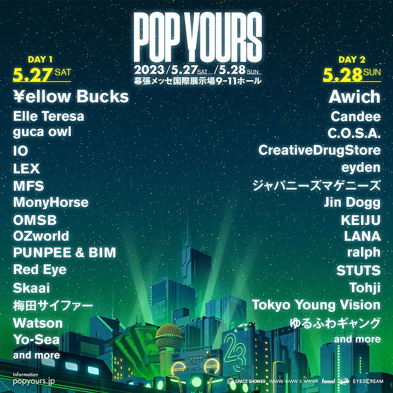 ヒップホップフェスティバル【POP YOURS 2023】が5月27日および28日の2日間、千葉・幕張メッセ国際展示場9~11ホールにて開催される。 同フェスは、“2020年代のポップカルチャーとしてのヒップホップ”をテーマに、2022年に初開催…