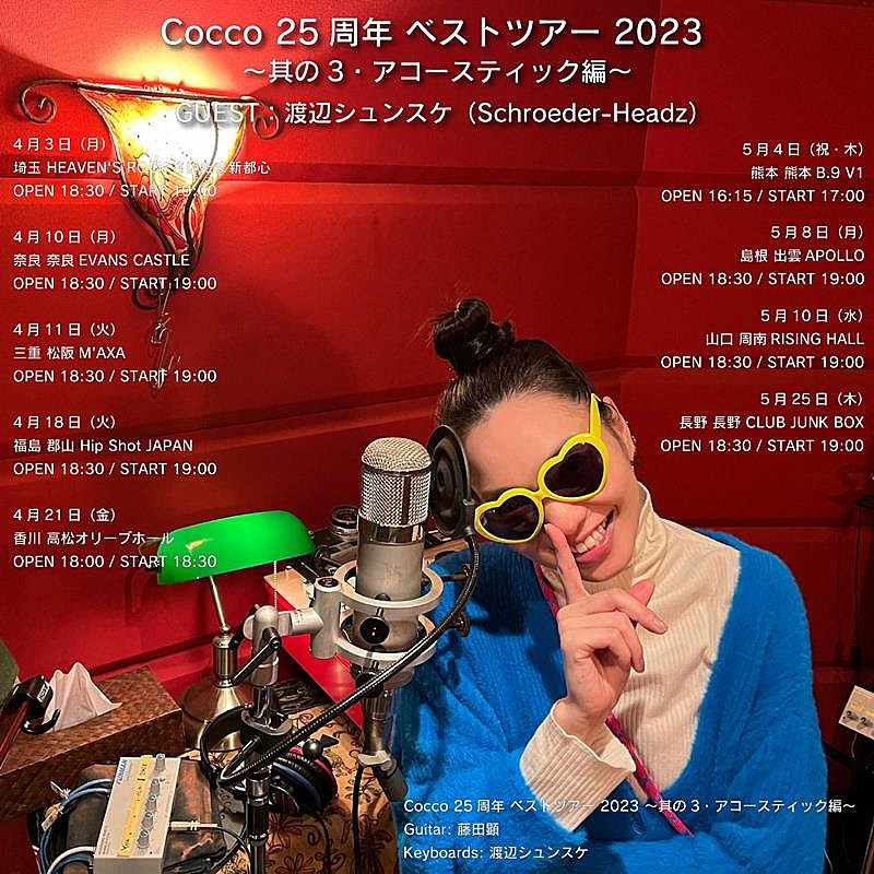 さらに、【Cocco 25周年ベストツアー 2023 ~其の3・アコースティック編~ GUEST:渡辺シュンスケ(Schroeder-Headz)】の開催が発表となった。今回のツアーは、アコースティック編ということで、Coccoのステージはギターに藤田顕(PLECTRUM)、キーボードに渡辺シュンスケ(Schroeder-Headz)を迎えての3人編成にて開催。さらにGUESTとして渡辺シュンスケ(Schroeder-Headz)のステージも見ることの出来る貴重な公演となる。