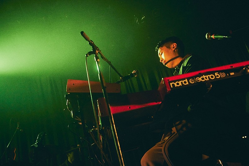 1曲目はアルバムのオープニングも飾る「朝靄」で、今にも消えてしまいそうな照明がチラチラと明滅するなか、ステージ上には仄かに人影が見えるレベルだ。アウトロの残響音から一瞬のブレイクを挟み、力強い歌い出しの「雨宿り」が始まると同時に、一気に明かりが演者を照らし出す。曲ごとにガラッと印象を変える光と映像の演出もこの日の見所だった部分で、映画監督としての一面も持つ甫木元空(Vo)の美的センスが大いに反映されていたのかもしれない。