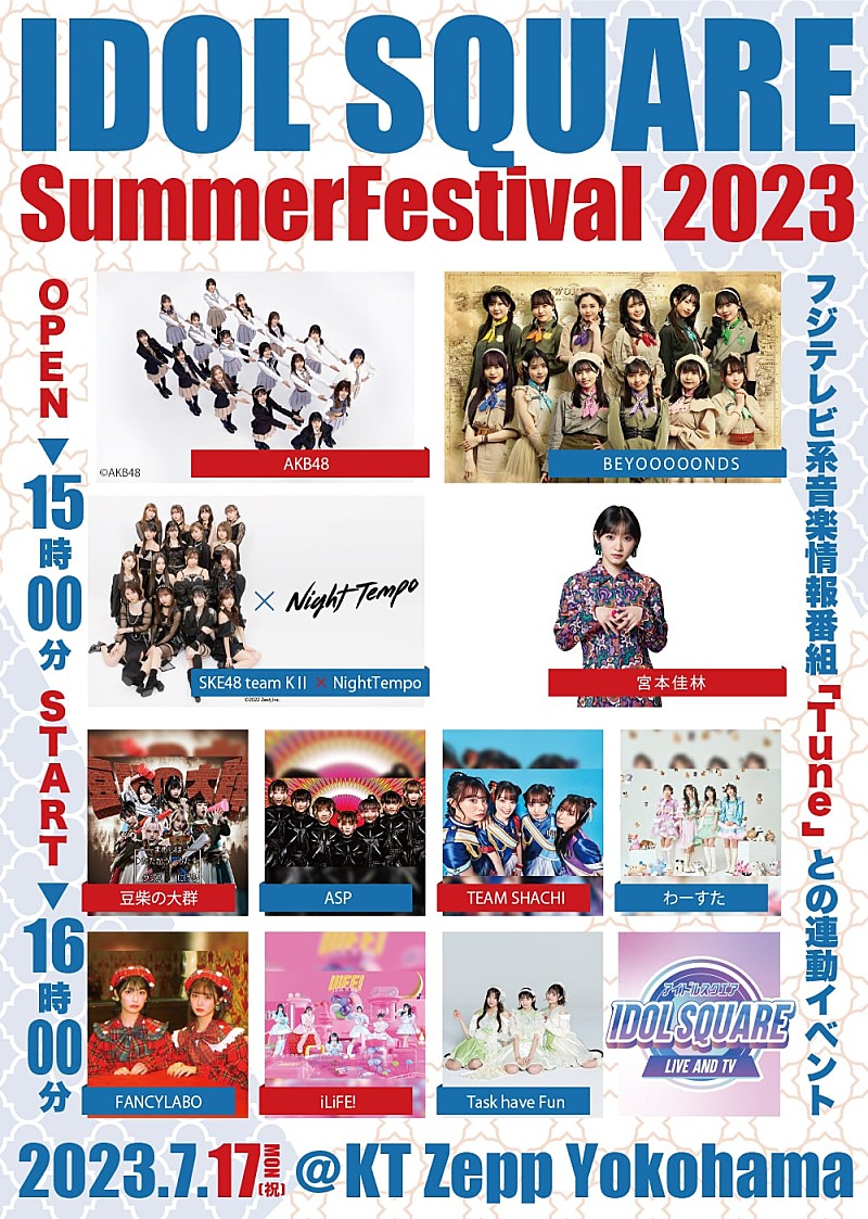 フジテレビ系音楽情報番組『Tune』と連動したライブイベント【IDOL SQUARE Summer Festival 2023】が、7月17日にKT Zepp Yokohamaで開催される。 イベントには、AKB48/BEYOOOOONDS/SK…