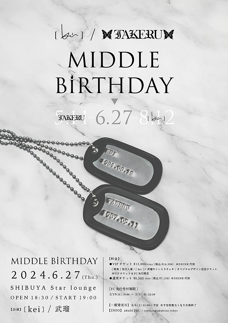 かねてより互いのライブや作品でコラボレーションしてきた[ kei ] ×武瑠が、6月27日(木)東京・渋谷スターラウンジにて初の2マンライブ【MIDDLE BIRTHDAY】を開催することが決定。これを記念し、3月19日にふたりのスペシャルコラボ…