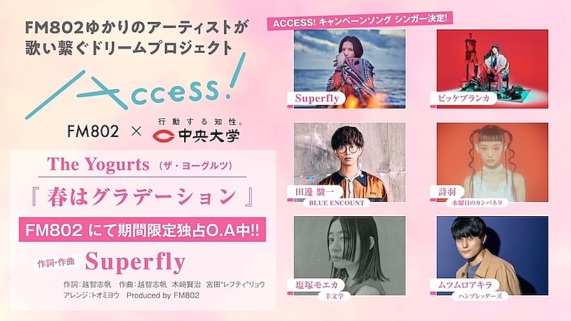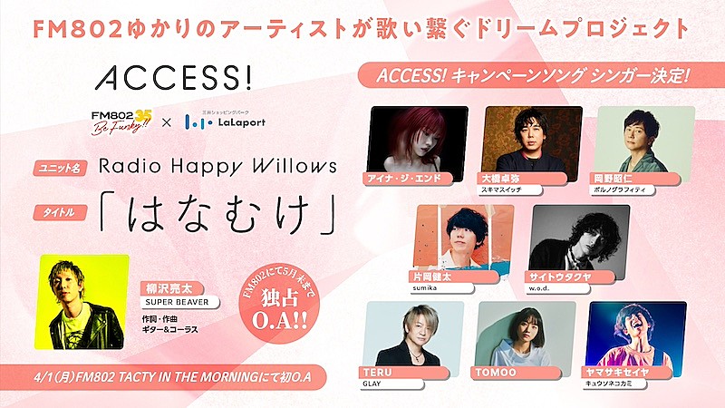 FM802が毎年春に実施する『ACCESS!キャンペーン』のキャンペーンングを、今年は柳沢亮太(SUPER BEAVER)が担当、参加アーティストも発表となった。 楽曲タイトルは「はなむけ」で、参加シンガーに、アイナ・ジ・エンド、大橋卓弥(スキマ…