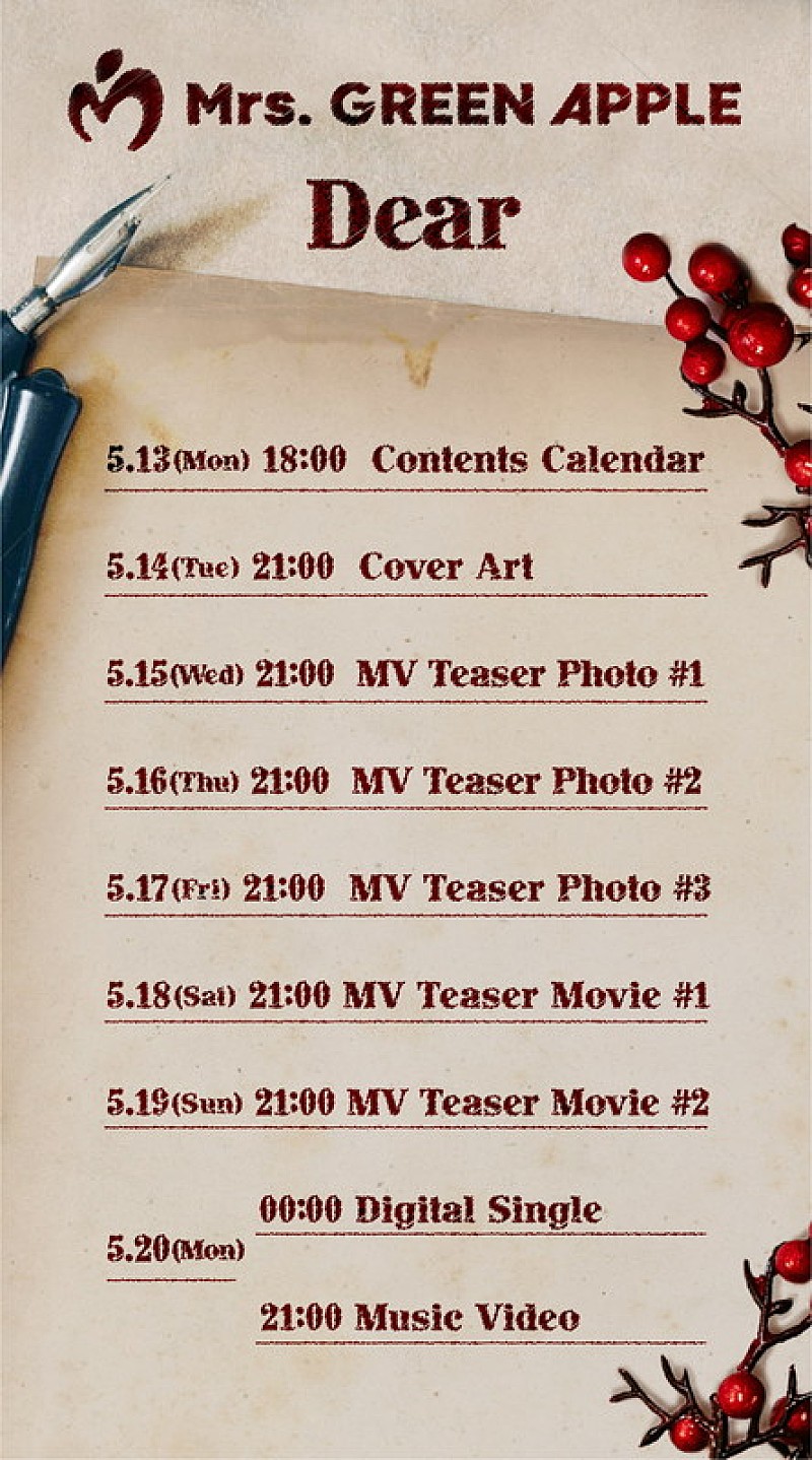 Mrs. GREEN APPLEが、2024年5月20日に配信リリースとなる新曲「Dear」のカバーアートを公開した。 新曲「Dear」は、清武英利による『アトムの心臓「ディア・ファミリー」23年間の記録』を原作とし、6月14日に公開される映画『…