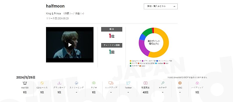 2024年5月29日公開(集計期間:2024年5月20日~5月26日)のBillboard JAPAN 総合ソング・チャート“JAPAN Hot 100”で、King & Prince「halfmoon」が総合首位を獲得した。