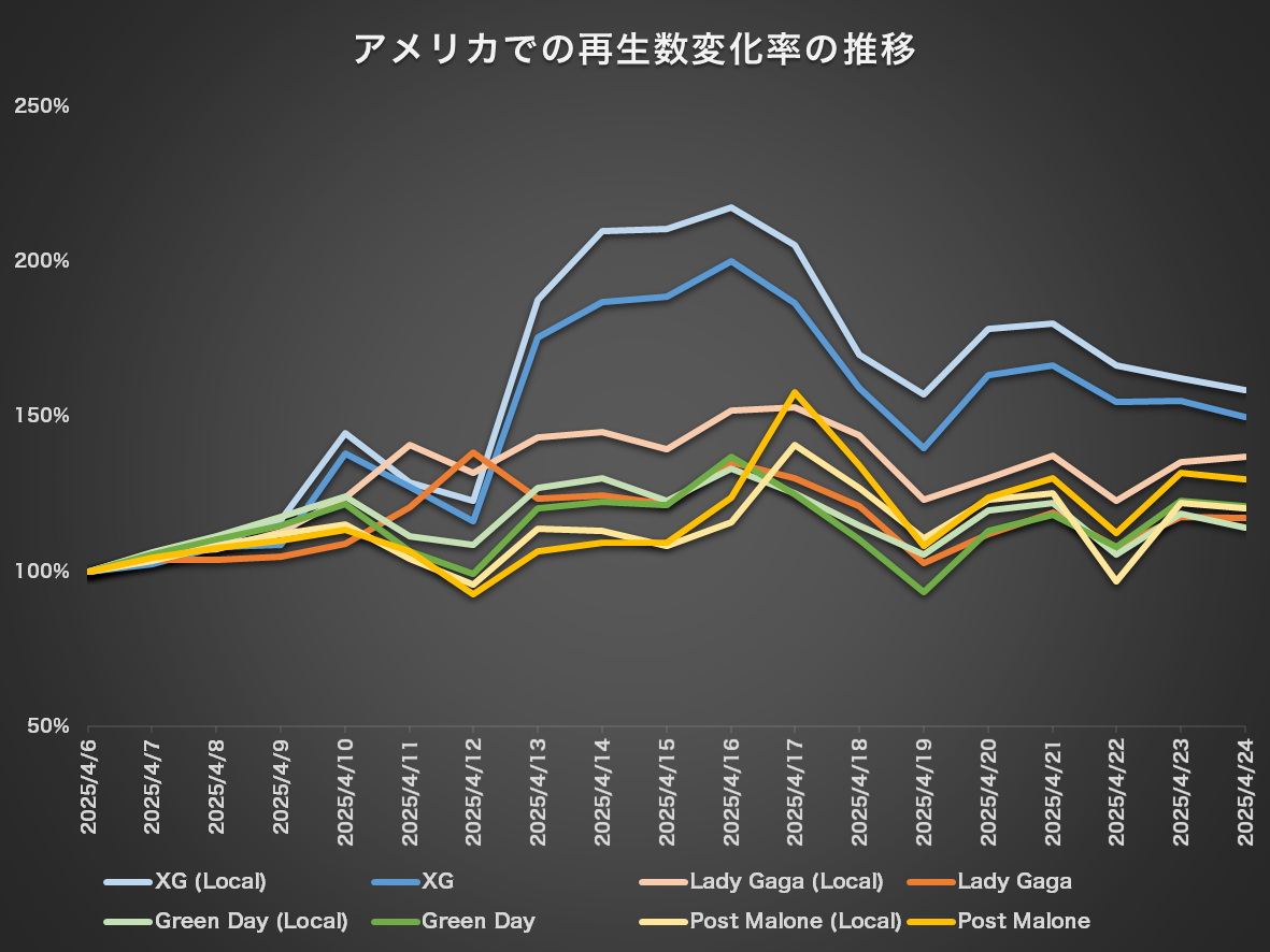 なお、4月17日にはシアトルにて【XG 1st WORLD TOUR "THE FIRST HOWL"】の追加公演が開催され、その影響か、【コーチェラ】のウィークエンド1とウィークエンド2の間においても再生回数の増加が観測された。