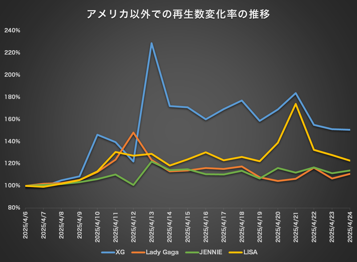 比較対象として、圧巻のパフォーマンスが話題となったレディー・ガガ、ならびに同じく非米国出身であるLISAとJENNIE(いずれもBLACKPINKメンバー)のデータも抽出。3組の最大変化率が約170%に留まる一方で、XGは最大約228%という伸びを記録した。これは、母国・日本を含む複数の地域での認知度が高まったことを示唆している。特に、【コーチェラ】というグローバル・フェスにおいて、リアルタイム配信やアーカイブ視聴を通じた可視性が飛躍的に高まり、ソーシャル・メディアとの連動による爆発的な拡散力が、その認知拡大に大きく寄与していると考えられる。