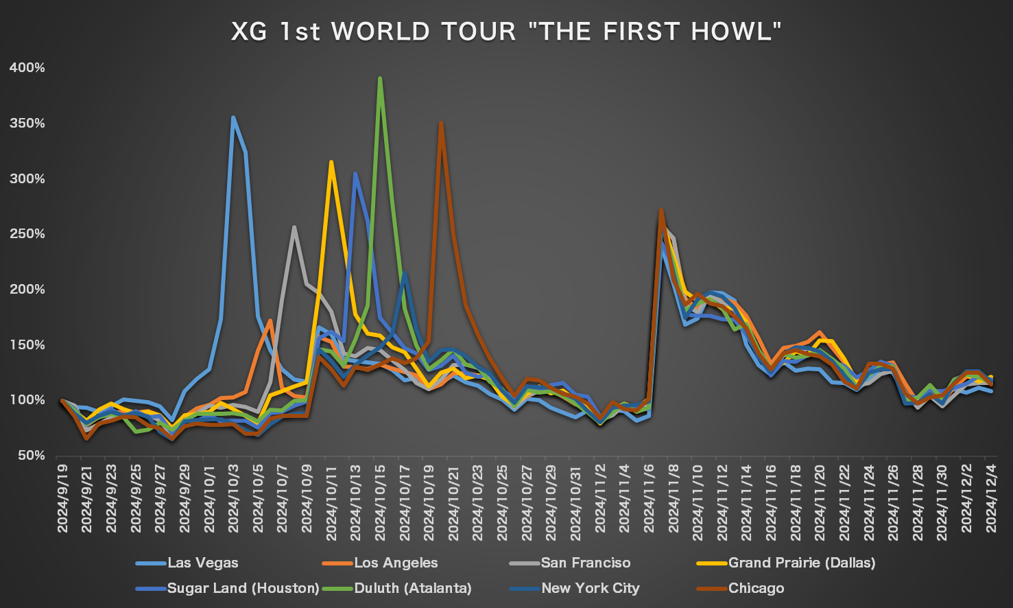 以上から、【コーチェラ】といった世界屈指の音楽フェスに出演する効果は明らかだ。では、海外で単独公演を開催することにはどのような効果があるのか。以下は、XGが2024年に【XG 1st WORLD TOUR "THE FIRST HOWL"】のアメリカ公演を開催した際、各都市における再生回数増加率の推移となる(2024年9月19日を基準、前述追加公演を除く)。主要都市近郊にて開催された公演は、隣接する主要都市のデータを使用している。