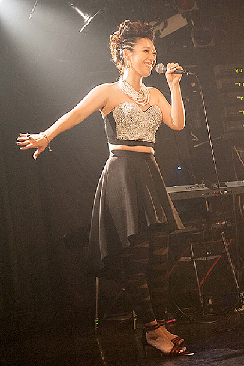 中盤、「みなさん、恋はしてますか?」と笑顔を見せたMCから「想う人へ ~おやすみ~」のゆったりとしたメロディを見事に歌い上げると、サックス奏者の藤田氏を招いた4人編成で、かつてChe'Nelleに提供した「クリスタルズ・オブ・ラヴ」のセルフカバーを熱唱。そして「かわいがってください」と披露されたのが、今回の会場よりリリースが開始した両A面シングル『赤い糸~君を温めたいと願うこの日々を今愛としよう~ / シイアワセ』に収録の「シイアワセ」だ。