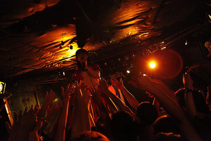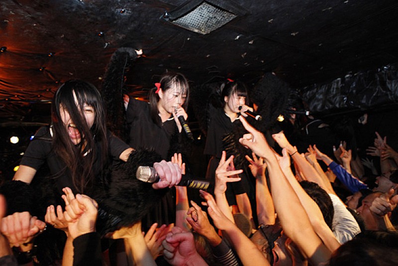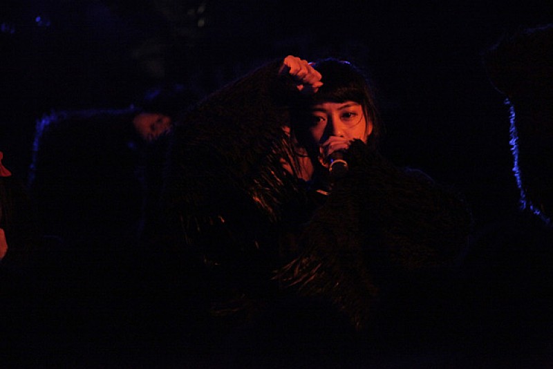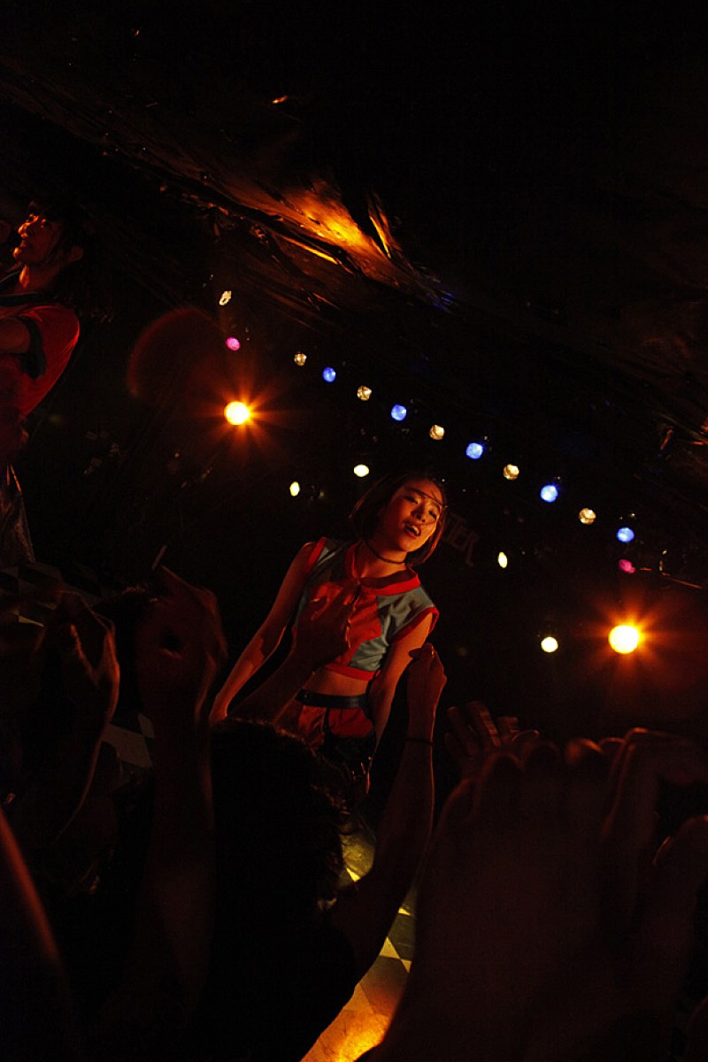 先手のBELLRING少女ハートは登場するなり、黒セーラー服と鳥の羽を激しく振り乱しながら、歌謡テイスト満載のサイケデリックかつプログレッシヴなナンバーを連発。奇声を上げながらエモーショナルに踊り狂い、「全員死んでください。本当に死んで」と柵によじ登って暴れる少女たち。その姿に超満員のアイドルフリークも激しく呼応していき、会場は異様なムードに包まれる。