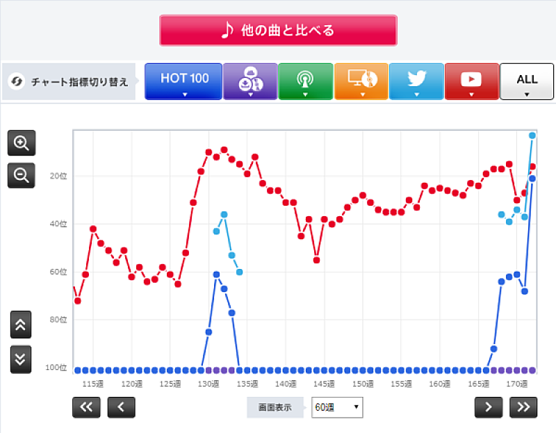 米津玄師のニューシングル「ピースサイン」の快進撃がスゴイ。リリースに先駆けて公開されたMVは公開から24時間で100万回再生の大台を突破、iTunesでは配信から僅か4時間弱でチャート1位を獲得、こちらの「Hot100」ではゆずやSEKAI NO OWARI、ジャニーズWEST等の名立たるビッグネームを抑え1位を獲得する等まさに破竹の勢い。「ピースサイン」が打ち立てた記録の数々はもはや“バズ”等という一過性のものではなく、彼の実力と人気が確固たるものであると改めてシーンに証明してみせた。更に今作は人気TVアニメ『僕のヒーローアカデミア』のOP曲に起用されている事もあり、これまでの彼のファン層だけではない新規ユーザー層、例えば原作ファンやアニメ好きの10代等、幅広い層へのアプローチが成功しているのだろう。それはチャートアクションとしても顕著で、今作「ピースサイン」を着火点として「Hot 100」圏内に過去曲が3曲同時にチャートインした(7/17付Billboard JAPAN HOT 100)ことでも分かり易く可視化されている。