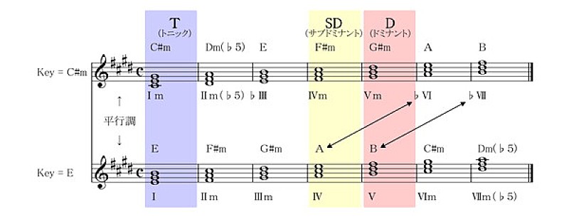 そこで、今回は曲調の心地よさを探ってみようと思う。キーはC#mでコード進行もC#m-F#m-A-Bと4つだけでリフレインしている。C#m(Ⅰm)からF#m(Ⅳm)までの関係が、トニックからサブドミナント(安定している響きから少し不安にさせる響き、もしくは次に展開したくなる響き)に、A(♭Ⅵ)からB(♭Ⅶ)までの関係が、サブドミナントからドミナント(次に展開したくなる響きから元に戻りたくなる響き)になっている。 ※画像3枚目参照