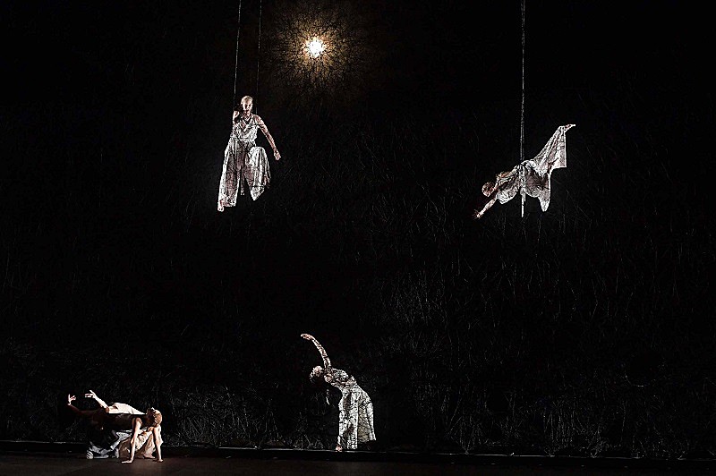 最も印象的な黒い糸が絡み合う巨大なインスタレーションは、サシャ・ヴァルツから塩田へ素材のリクエストがあったり、細川とヴァルツは台本についても意見交換をするなど、その創作の過程は、ダンス、美術、作曲それぞれが相互にアイディアやリクエストを交歓しながらの共同制作であったようだ。各インタビューは新国立劇場公式サイトで読むことが出来る。
