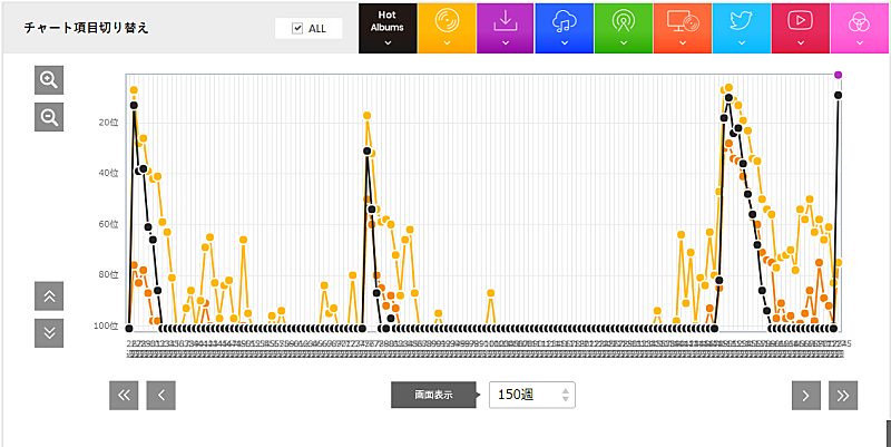 この影響は、さっそくチャートにも反映された。今週のHot Albumsでは、2012年に発表した40周年記念のベスト・アルバム『日本の恋と、ユーミンと。』が、なんと9位にまで急上昇(【表1】)。実はこのアルバムは、何度もチャートを再浮上している。本作の“GOLD DISC Edition”がリリースされた2015年11月、アルバム『宇宙図書館』が発表された2016年11月、そしてデビュー45周年を記念した続編のベスト・アルバム『ユーミンからの、恋のうた。』をリリースした今年の4月と、何度も山を迎えているのだ。今回もそのひとつではあるが、ストリーミングという手軽なサービスが浸透すれば、さらにチャートイン期間も伸びるに違いない。『ユーミンからの、恋のうた。』も、圏外から28位にまで上昇しており(【表2】)、本作も今後は同じような動きをしていくことだろう。
