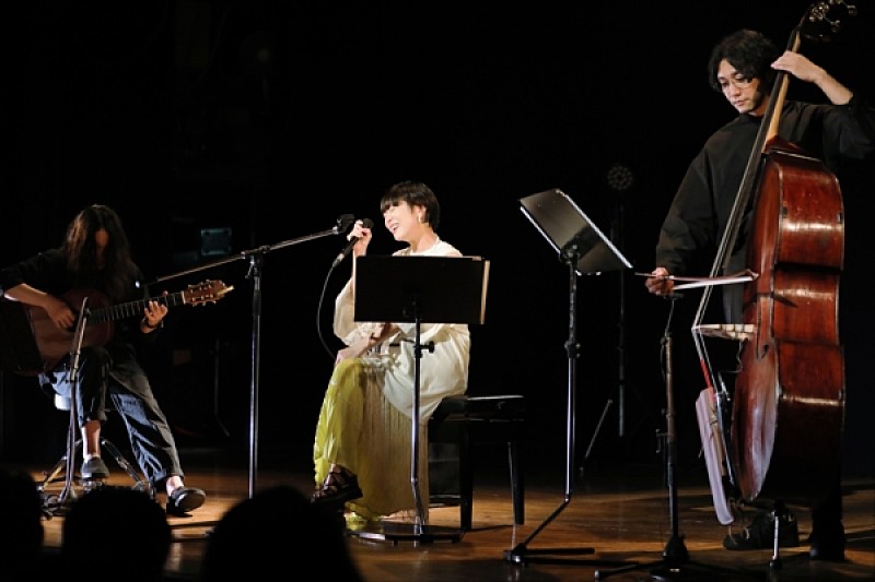 会場は着席スタイルでゆったりとした雰囲気が漂うなか、ライブは「emergency sign」からスタート。やさしいギターの音色とどこか浮遊感をまとうようなウッドベースの音色に、Salyuの温度感あるボーカルが溶けて、特別な夜の気配が生まれる。そしてその感触は「リスク」で深い夜の怪しさへ。少女のような無邪気さが残る歌声は徐々に熱を上げてハイトーンへと変わって人々を曲の物語へと引き込み、地続きのように次の「エロティック」のムーディーな世界へと誘う。繊細に震えて鼓膜を刺激するSalyuの声は語りかけるような生々しさもあり、うつむきがちに目を閉じて放たれる〈ah〉のコーラスはたっぷりの熱量。わずか3曲で3人の作る夜景が会場に広がる。