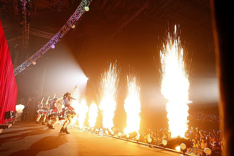 その後トロッコでアリーナを周回し、「涙は似合わない」「MISSION SURVIVOR」を披露すると、「PANDORA」「HOT UP!!!」のハードなロックチューンで会場を盛り上げていく。メイクアップの小コント(?)から「オメカシフィーバー」、そして「元気しかない~サドンデス」のメドレーをはさみ、最後は「10年間引き継いで、動かし続けてきた私たちエビ中の心臓の音を聞いてください」(柏木ひなた)のMCから、「ジャンプ」を熱唱し本編を締めくくった。