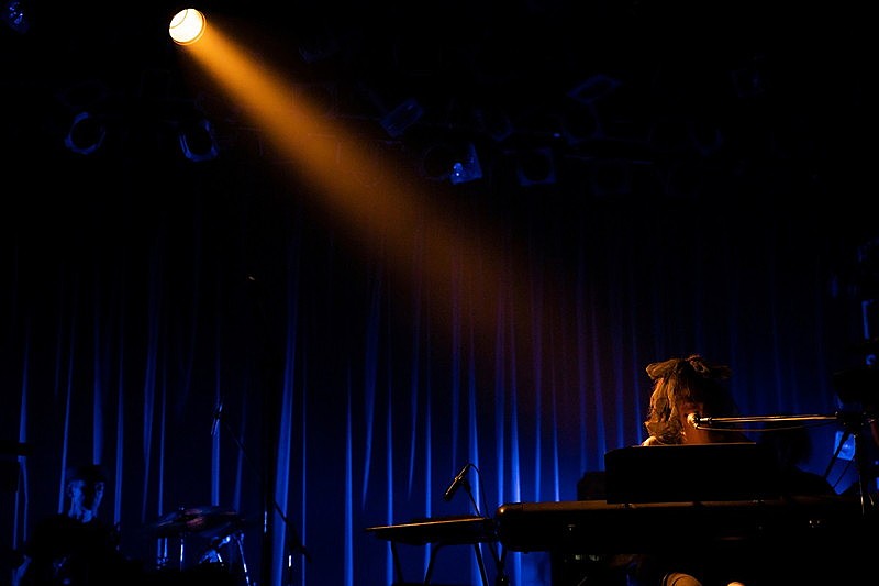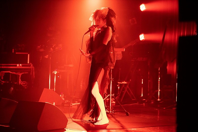 映像がライブステージに切り替わり、バンドメンバーが持ち場に立つ。いつものホールツアーのようなフルセットではなく、今回はデビュー当時からCoccoのサウンドを支えてきた根岸孝旨(Bass)、同じくCoccoが全幅の信頼を寄せる椎野恭一(Drum)、そして初期からの縁で、『スターシャンク』で久しぶりにCocco作品に携わった堀越信泰(Guitar)というシンプルなバンド編成。いずれも「ダークサイドクイーン」Coccoの良き理解者であり、ライブハウス仕様のスリリングなバンドサウンドを奏でるに申し分ない布陣だ。ほの暗いステージに黒いドレスにベールで顔を覆ったCoccoが登場し、『スターシャンク』の1曲目に収録されている「花爛」でライブはスタートした。堀越がボウイングでギターを奏で、原曲よりも不穏でヒリヒリとした音像が浮かび上がる。Coccoのどこか深い暗闇から響いてくるようなスクリームにも、今回のライブの趣旨が浮かび上がる。ダークでアップタイトな歌声とサウンド、それはつまり楽曲が生まれるときに一番初めにCoccoの頭の中で鳴っているプリミティブな音のイメージに近いのではないかと。この曲を皮切りに、この日のライブでは驚きのアレンジで『スターシャンク』の曲たちが披露されていった。