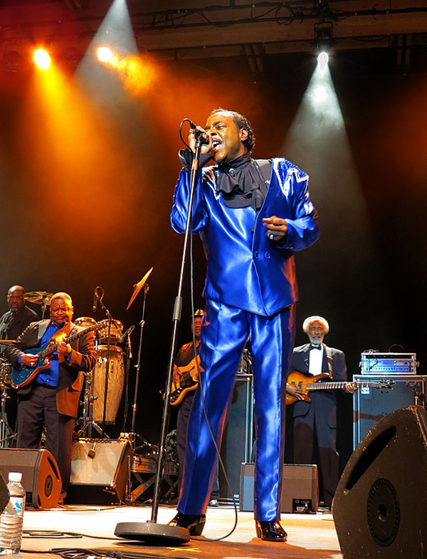 さて、今回来日するジェームス・ブラウン・バンドのメンバーは、とにかく豪華だ。長年JBとステージをともにしているバンド・リーダーのルーズベルト・“RJ”・ジョンソン、60年代から断続的にツアーに参加していたヴォーカリストのマーサ・ハイ、晩年のJBバンドでサックスを吹いていたワルド・ウェザーズ、ブーツィー・コリンズの後釜としてファンキーなベースラインを弾いていたフレッド・トーマス、10代でJBに見初められたというドラマーのトニー・クック、晩年のバンドで屋台骨となったドラマーのエリック・ハーグローヴ、ライヴ・エイドなどの大舞台にも立ったコーラス隊ビタースウィーツのメンバーなどが大挙参加している。なかでも絶対に見逃せないのは、ダニー・レイだ。名前は知らなくても、名調子でJBを舞台に呼び込む司会者であり、あのマント・ショウ(Cape Act)に欠かせない人物といえばわかるだろう。JBのライヴは、彼の存在そのものが重要な演出であったし、本人亡き後のジェームス・ブラウン・バンドにとっても同様だ。