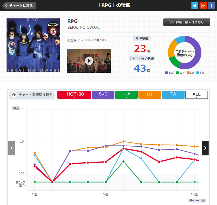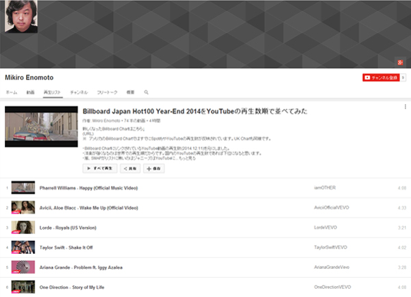 Billboardのアメリカ版やUK Chartだと、YouTubeやSpotifyの再生数がチャートに反映されてますね。若年層が最も音楽を聞いている場所はYouTubeなど無料動画と、レコ協などのデータにも出ています。日本版は今回は間に合わず、鋭意交渉中とのことで楽しみですが、待ちきれないので「YouTubeの再生順」を自分で作ってみました(http://goo.gl/BpF4MA)。こちら、わかりやすくするため邦楽を先にして、洋楽は後ろに下げてあります。