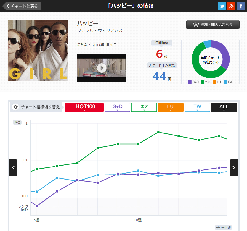 今年のチャートで最も興味深いのは、何と言ってもファレル・ウィリアムスの「ハッピー」だろう。もちろんロビン・シックやダフト・パンクとの共同作業で、ファレルが2014年最も重要なアーティストであることはすでに予言されていた。けれども、誰がこの「ハッピー」で踊った人々が自分たちで映像を撮影してオリジナルのPVを作ってネットにアップしていくなんて状況を想像しただろうか。チャートランキングという点ではややスロースターターだったこの曲は2月から3月にかけて世界中からPVがアップされ始められると、YouTubeやTwitterで大きな話題となり、異例のロングセラーとなった。ソーシャルメディアと音楽の幸福な出会いを象徴する楽曲である。